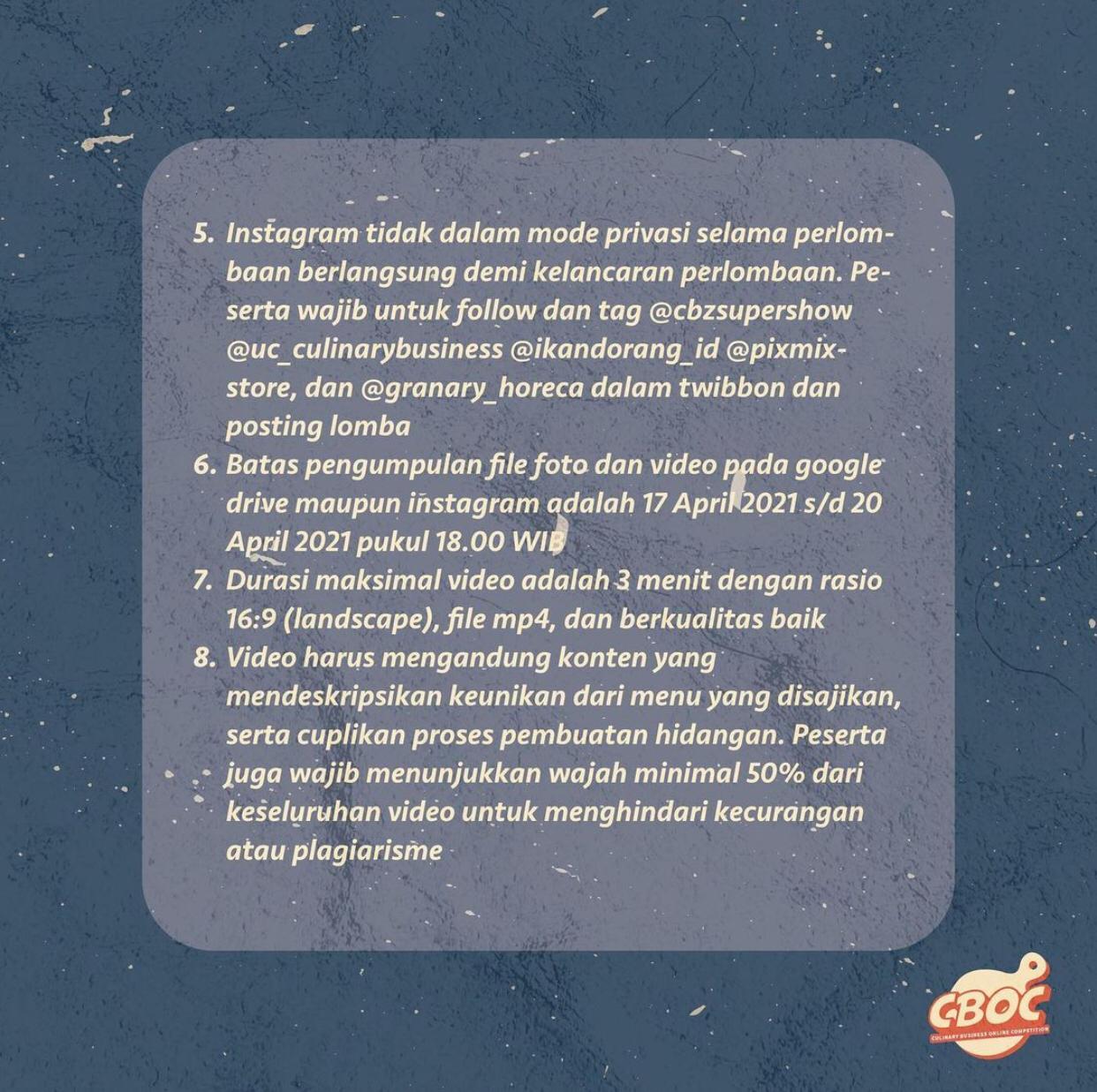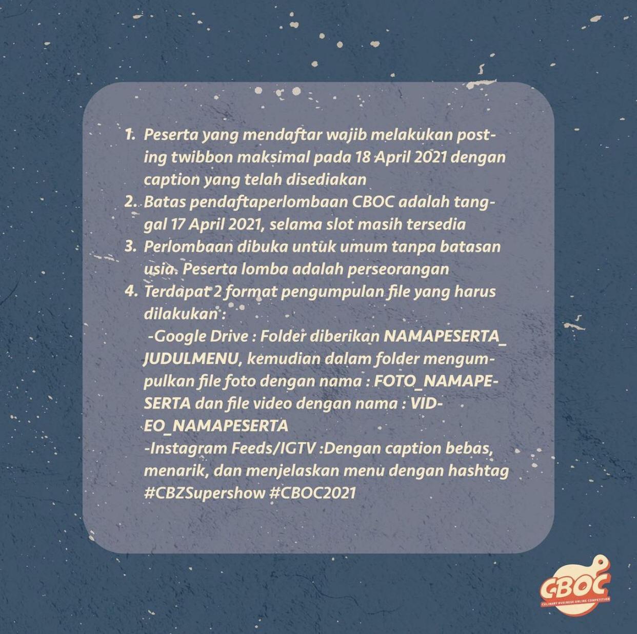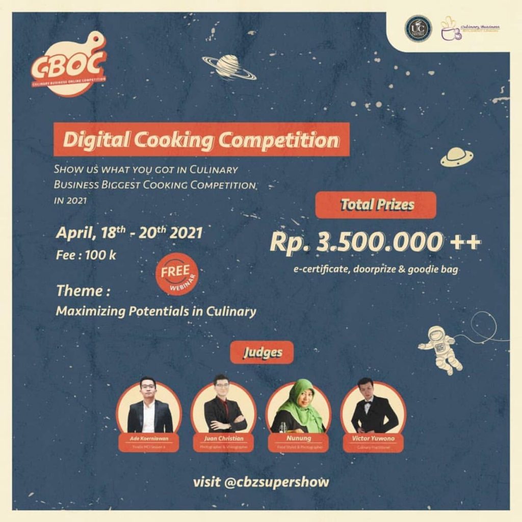 Kegiatan tahunan yang diadakan oleh Student Union CBZ pada tahun ini harus dilakukan secara online, karena masih dalam pandemi COVID-19. Kegiatan berjudul Culinary Business Online Competition ini berlangsung pada tanggal 18-20 April 2021.