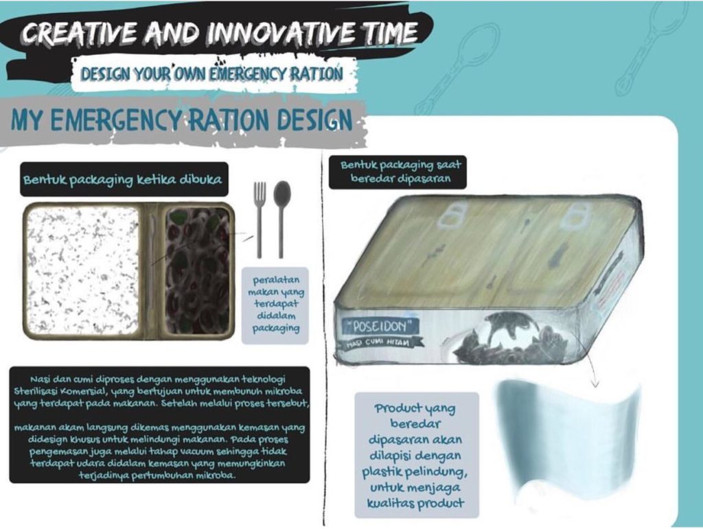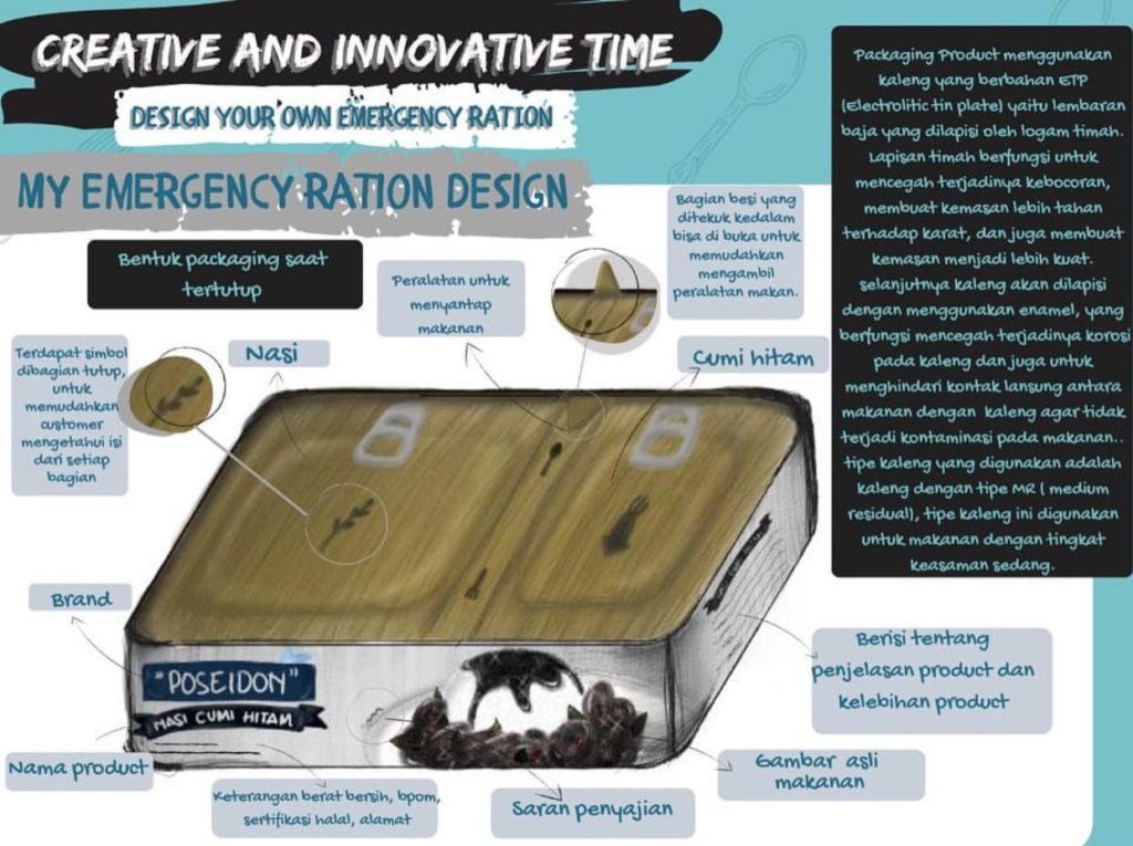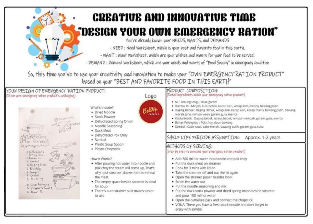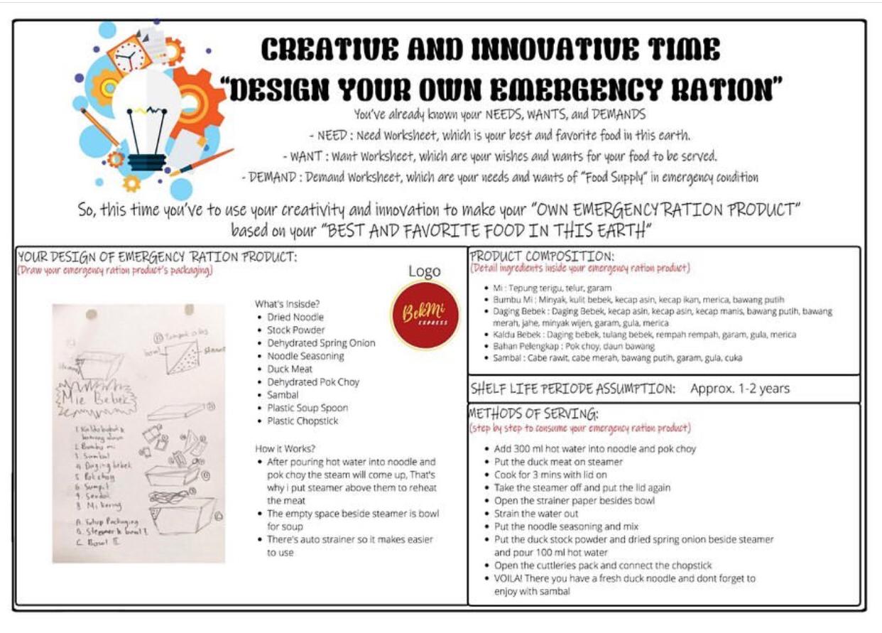 Mata Kuliah Leisure Business mengemas ujian akhir semester dimana mahasiswa diminta secara individu menampilkan konsep produk yang ditampilkan secara online di Instagram. Topik ujian akhir semesternya adalah Emergency Ration.
