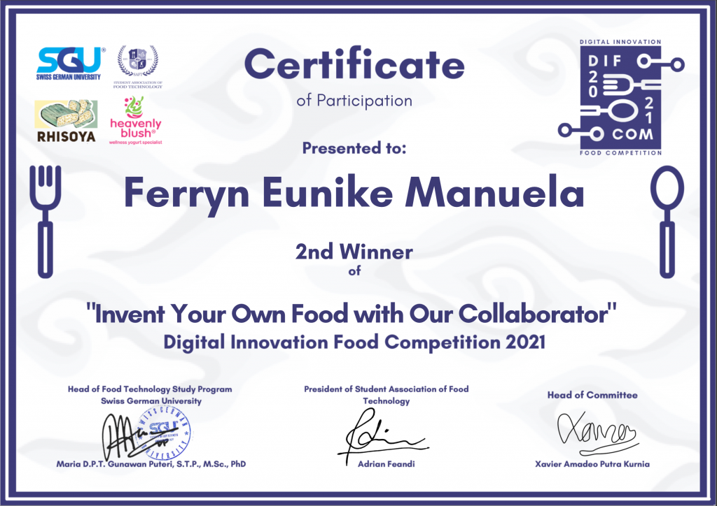 Mahasiswi Program Studi Tourism-Culinary Business (CBZ) berhasil menjadi juara 2 Lomba Digital Innovation Food Competition: Invent Your Own Food with Our Collaborator yang diadakan oleh Program Studi Food technology Swis German University, pada tanggal 14 Oktober – 6 November 2021 lalu. Mahasiswa/i: Ferryn Eunike Manuella (2019)