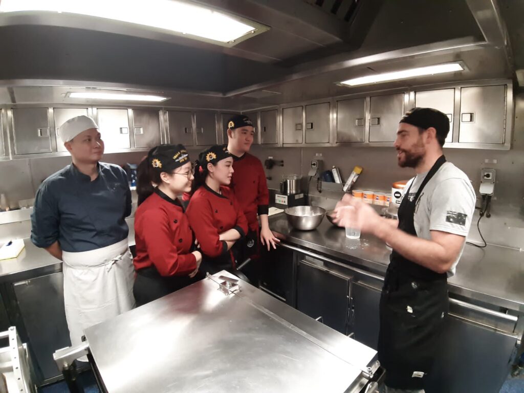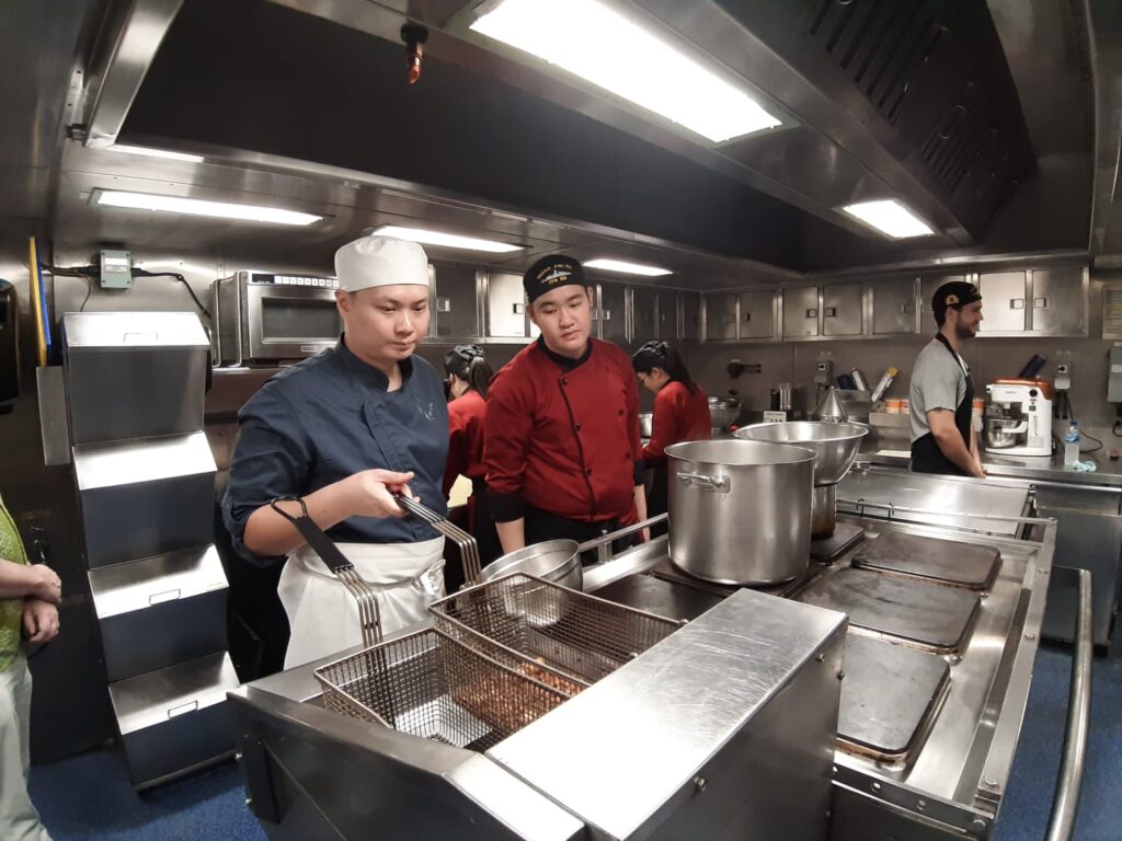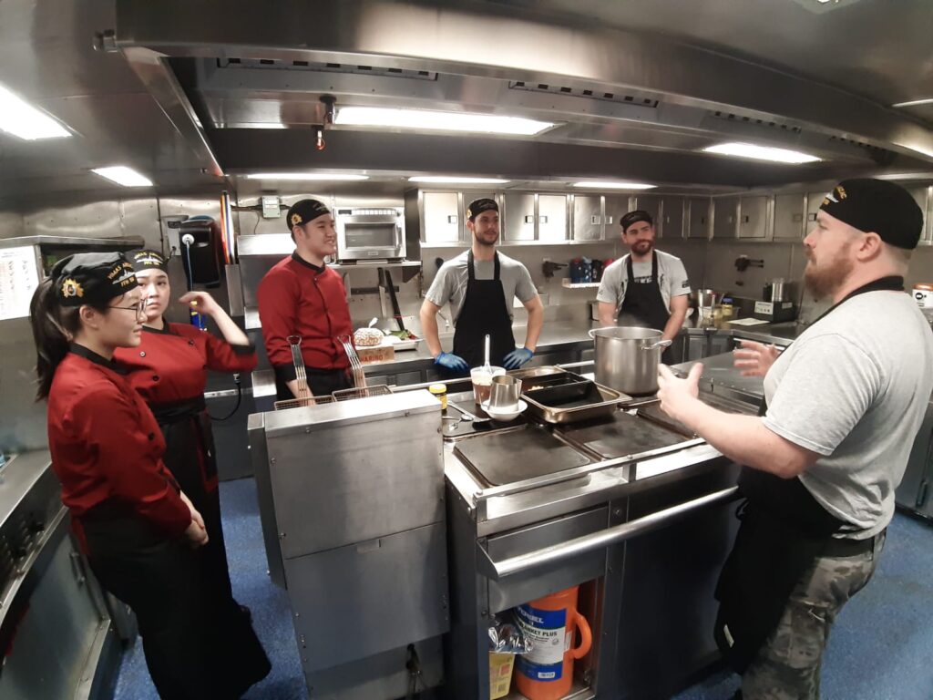 3 perwakilan mahasiswa Program Studi Tourism-Culinary Business (CBZ) juga berkesempatan untuk mendapatkan pengalaman memasak di atas kapal perang HMAS Anzac (FFH 150), serta bertemu dan belajar langsung bersama on board chef HMAZ Anzac