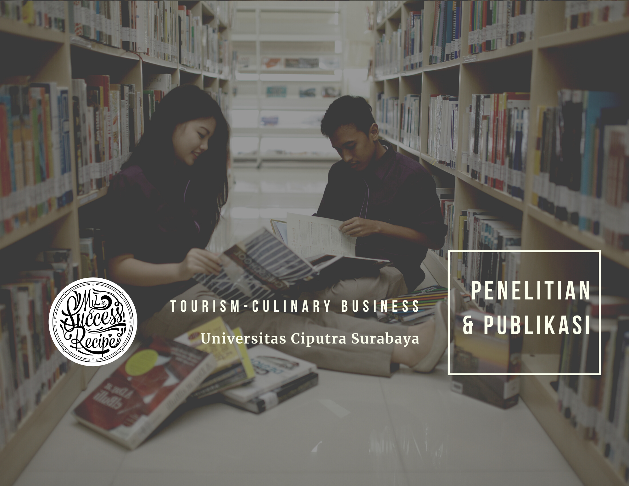 Program Studi Pariwisata-Bisnis Kuliner (CBZ) menghadirkan beberapa penelitian yang ditujukan untuk kreasi olahan pangan, bisnis kuliner serta pariwisata. Beberapa kegiatan penelitian dilakukan dosen dan staf dalam sinergi dengan kegiatan Pengabdian Masyarakat. Penelitian juga melibatkan mahasiswa dalam bentuk Tugas Akhir yang menghadirkan kreasi produk yang siap dijual dan dikonsumsi masyarakat.