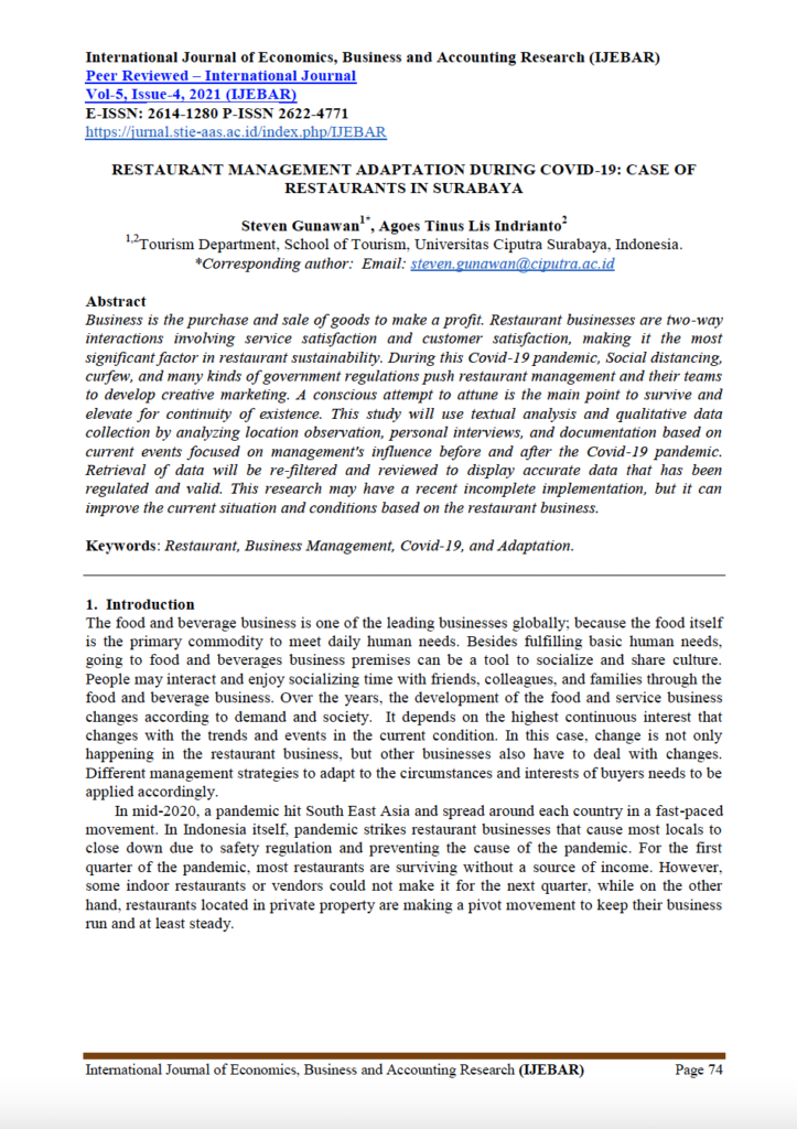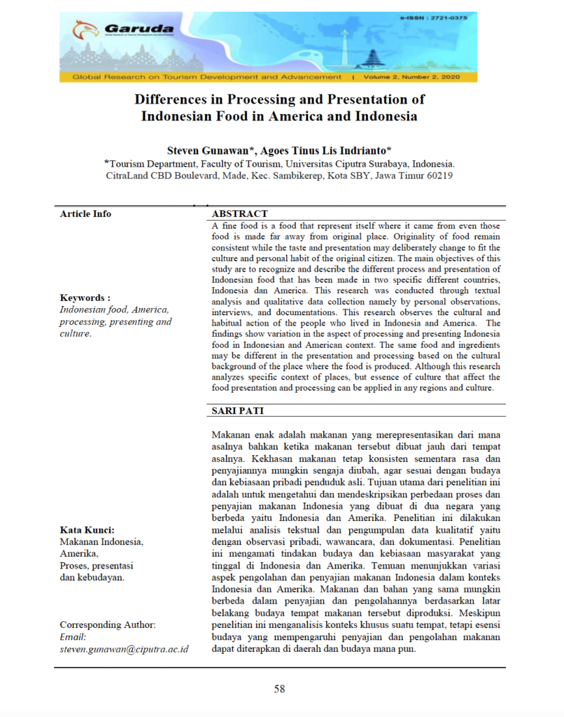 Program Studi Pariwisata-Bisnis Kuliner (CBZ) menghadirkan beberapa publikasi buku, hasil penelitian dan/atau pengabdian masyarakat yang mengangkat topik kreasi olahan pangan, bisnis kuliner, entrepreneurship, bisnis & manajemen serta topik mengenai pariwisata. Publikasi ini juga melibatkan mahasiswa yang diangkat dari bentuk Tugas Akhir ataupun penelitian mandiri.