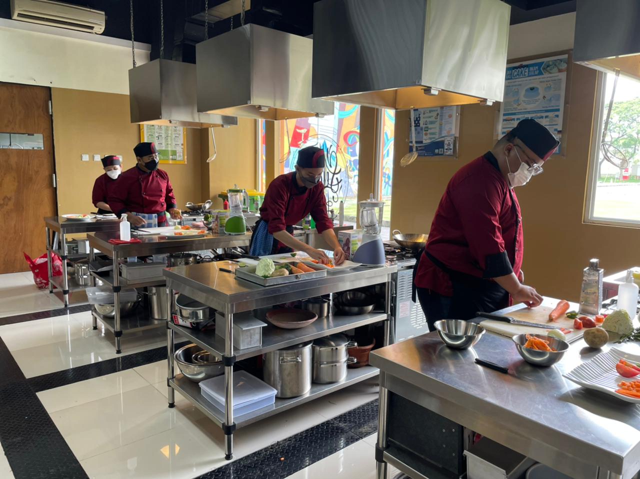 Praktik memasak dalam mata kuliah Hospitality Business dimulai dengan mahasiswa mempraktikkan hasil pengamatan sebelumnya ketika dosen mengajarkan berbagai macam jenis potongan sayuran yang biasa digunakan. Setiap mahasiswa mempraktikkan berbagai jenis potongan sembari para dosen berkeliling untuk mengecek cara potong, cara memegang pisau hingga mengevaluasi hasil potongan.