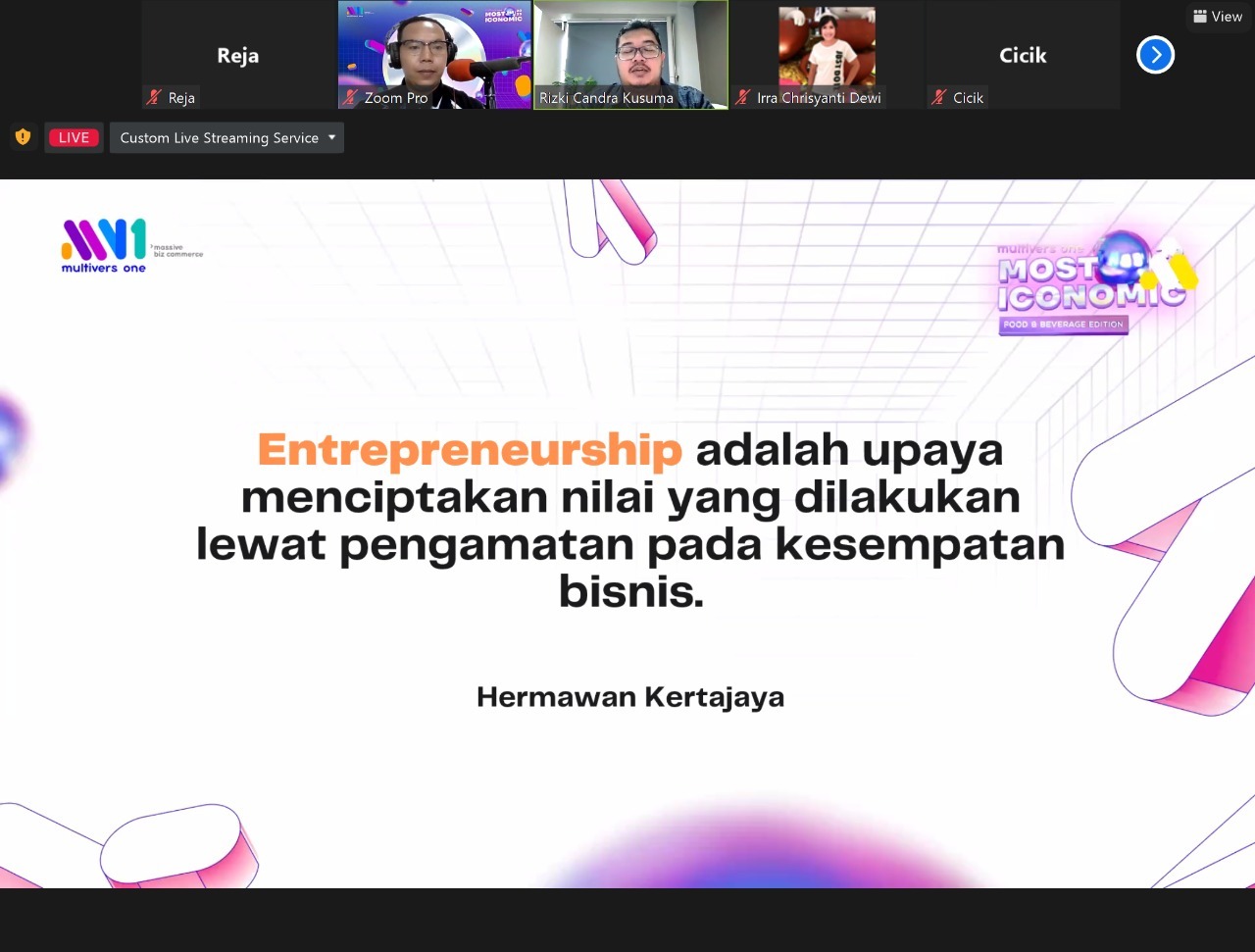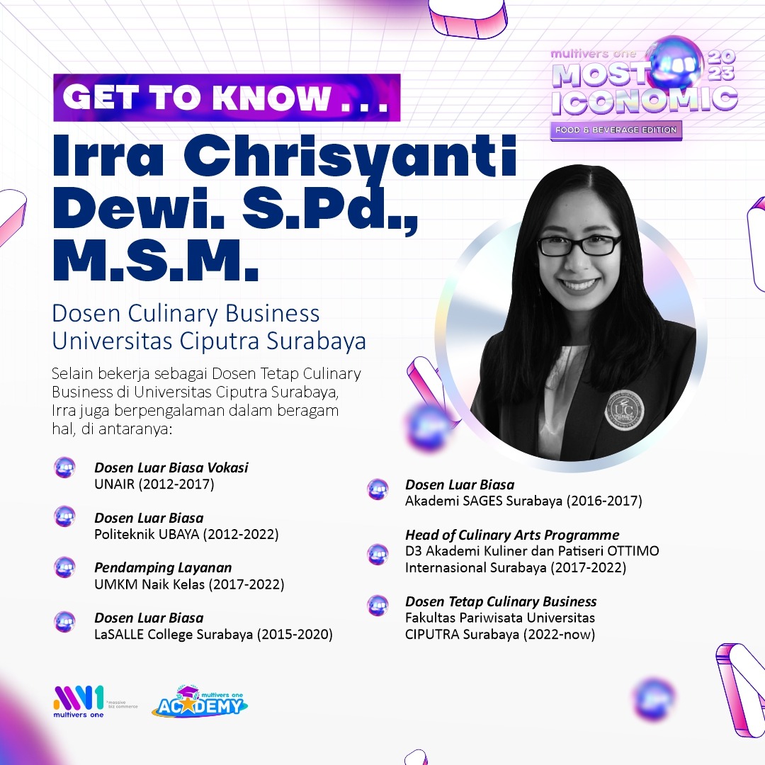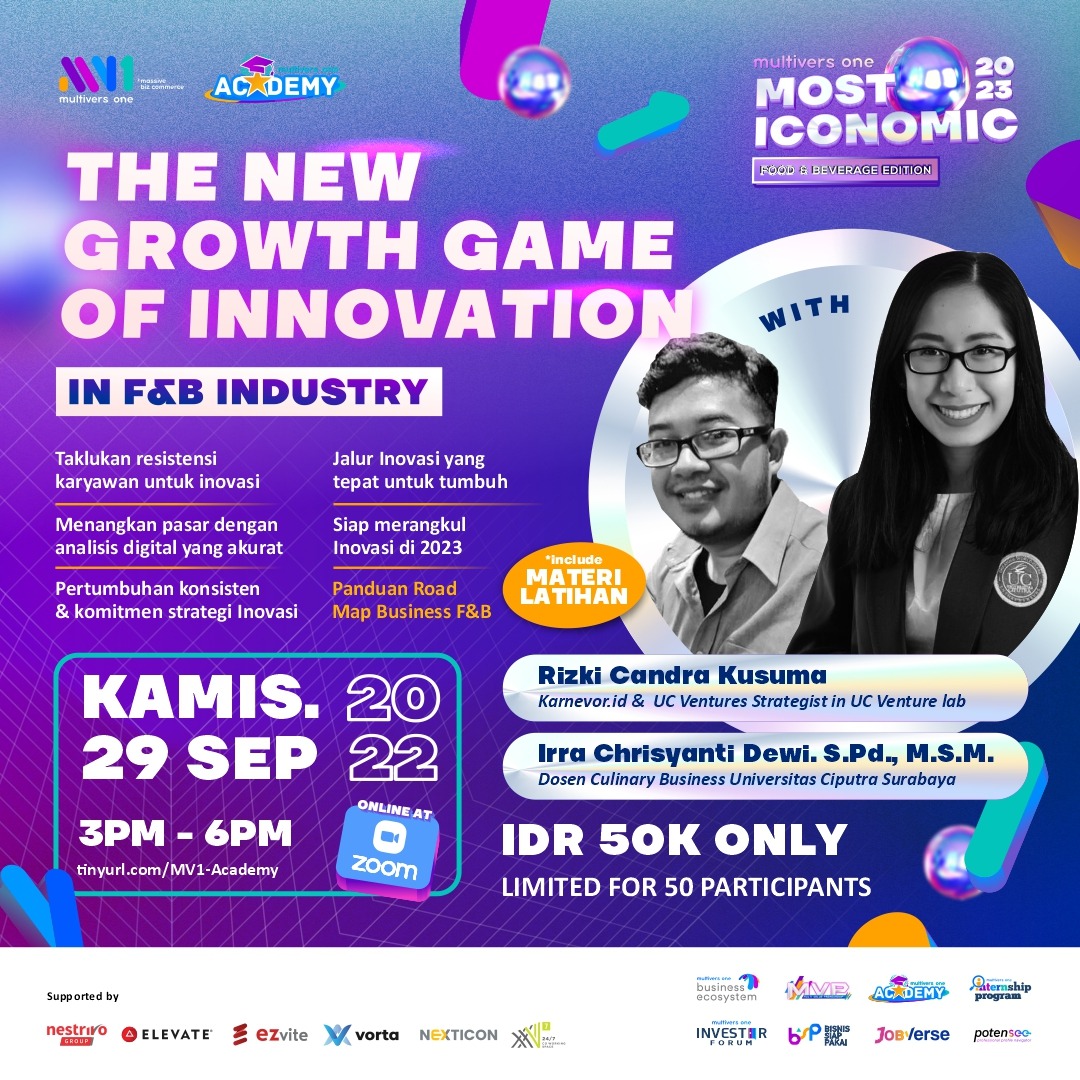 Webinar dengan topik The New Growth Game of Innovation in F&B Industry berlangsung secara online pada tanggal 20 September 2022 lalu dengan salah satu pembicaranya adalah dosen Program Studi Tourism-Culinary Business (CBZ), bu Irra Chrisyanti Dewi, yang bersama dengan Rizki Candra Kusuma membagikan beberapa hal yang dibutuhkan dalam persaingan bisnis food & beverage saat ini.