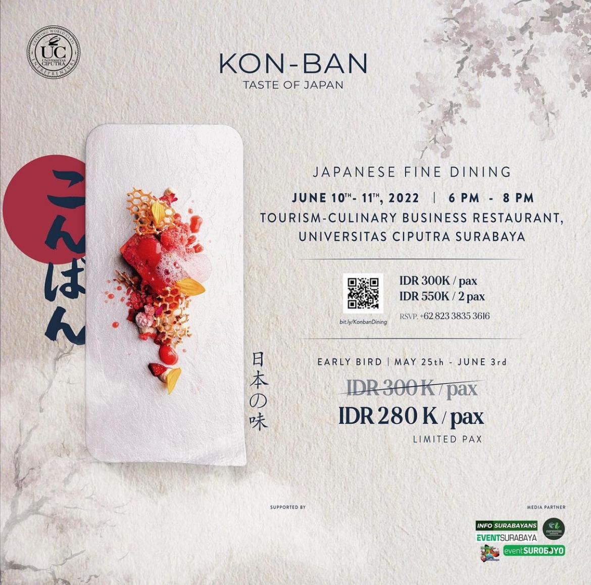 Semenjak diperbolehkannya perkuliahan tatap muka di Universitas Ciputra sejak semester genap 2021/2022 maka eksekusi project mahasiswa untuk beberapa mata kuliah di Program Studi Tourism-Culinary Business (CBZ) juga melangsungkannya secara offline atau on-site. Mahasiswa CBZ semester 6, angkatan 2019 akan melaksanakan project fine dining untuk umum. Project untuk mata kuliah Tourism & Hospitality Business serta mata kuliah Tourism Practice dibagi dalam 2 kelompok besar dan salah satunya mengambil tema modern Japanese Food dan mengambil nama project: Kon Ban Dining.