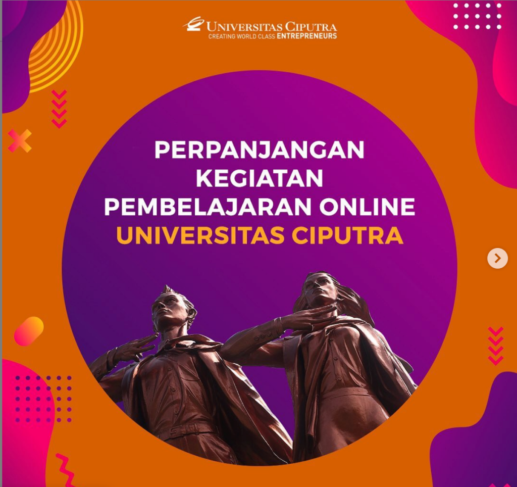 Perkuliahan di Universitas Ciputra terdampak pandemi Covid-19, sejak Maret 2020 perkuliahan dilakukan secara online. Pelaksanaan UTS pun yang semula dijadwalkan pada 16-20 Maret 2020, demi keamanan dan kenyamanan semua pihak maka dilakukan secara online atau dibuat dalam bentuk take home test.