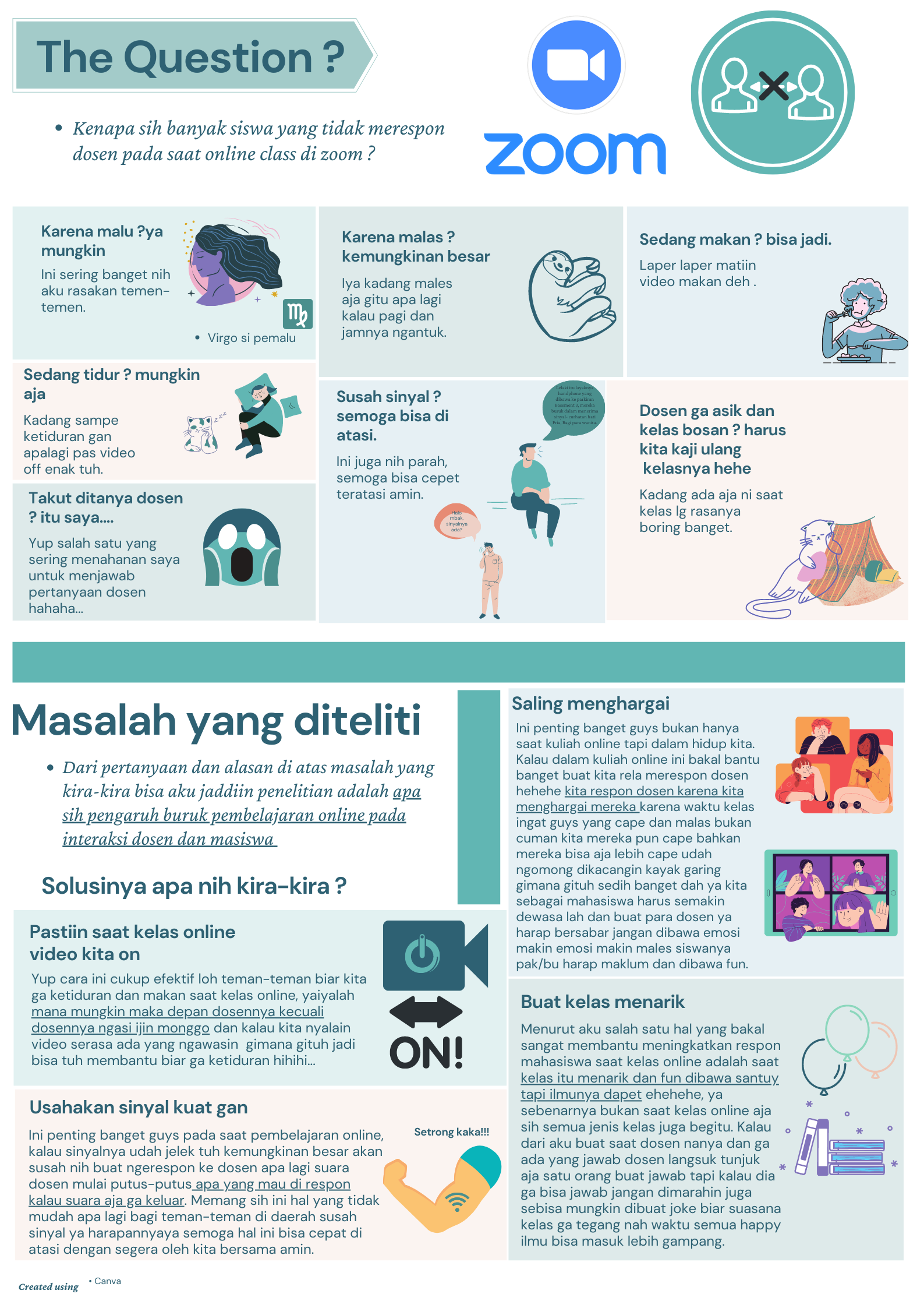 Mahasiswa pun melihat beberapa hal dalam efektivitas dan menariknya pembelajaran secara online. Mahasiswa tetap berharap materi dapat tetap tersampaikan dengan benar dan dengan cara yang menarik. Berikut ini beberapa pengamatan dan soulsi yang diberikan mahasiswa agar pembelajaran online dapat berlangsung menarik dan efektif.