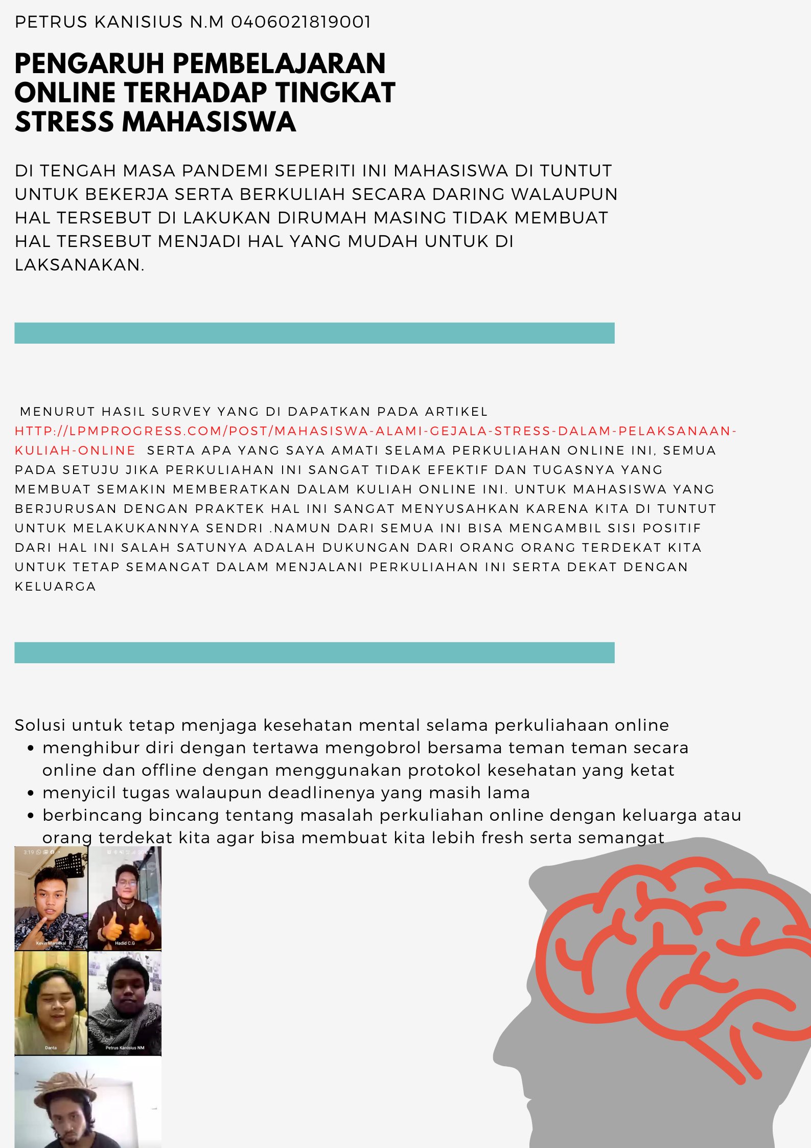 Pembelajaran secara online ternyata membuat tidak hanya para pengajar menjadi stress dengan perubahan yang ada, namun dari sisi mahasiswa pun, menganggap pembelajaran secara online kurang efektif ditambah lagi dengan beban tugas yang membuat tingkat stress mahasiswa bertambah.