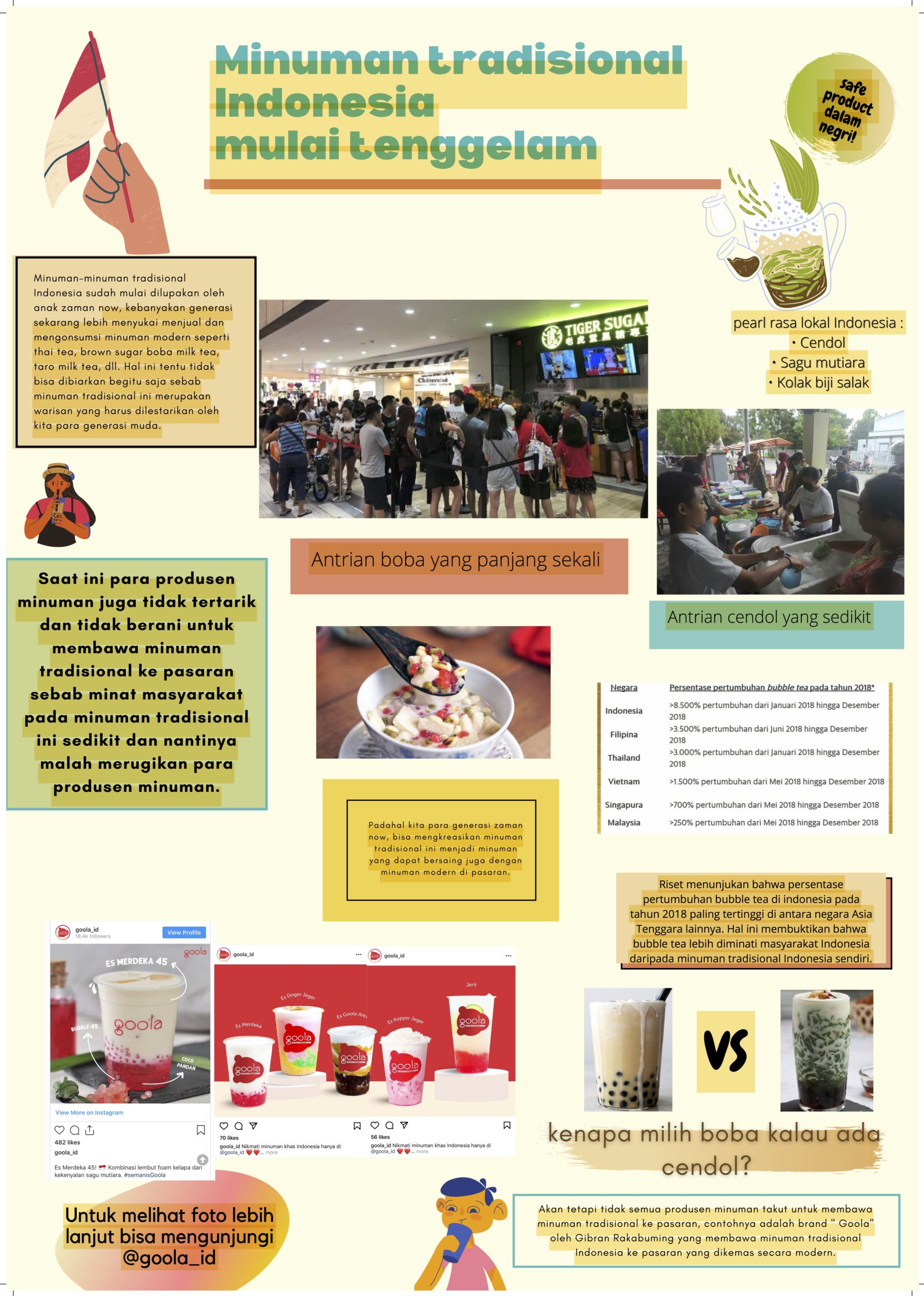 Minuman modern seperti thai tea, brown sugar boba milk tea, taro milk tea seakan lebih dikenal dan disukai oleh banyak generasi muda. Hal ini mendorong banyak pihak, termasuk generasi muda untuk mengangkat makanan atau minuman tradisional agar dikenal kembali oleh masyarakat khususnya generasi muda.