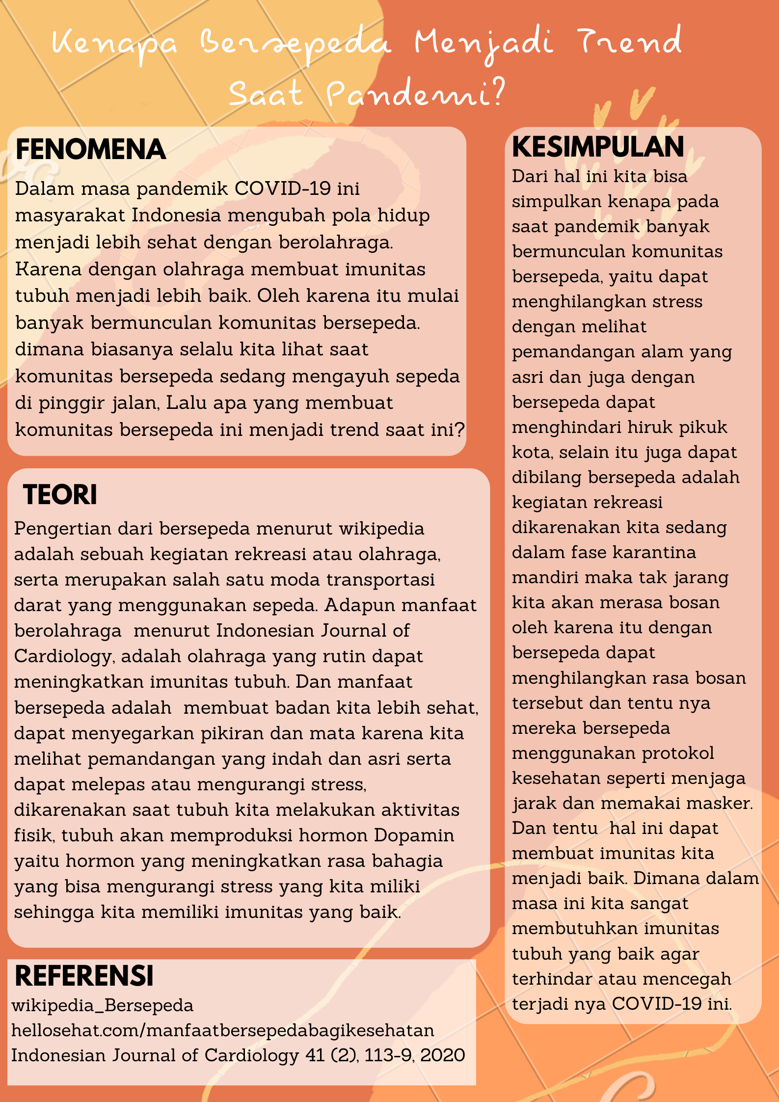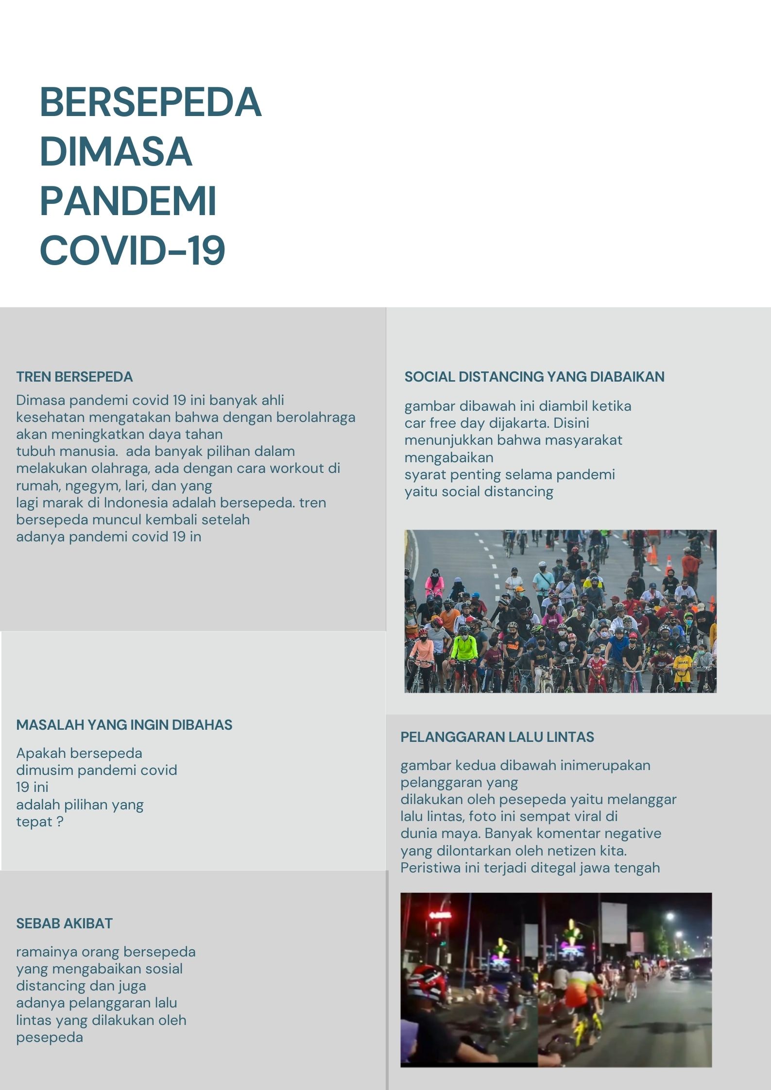 Bersepeda atau berolahraga memang sangat disarankan untuk dapat menjaga kesehatan atau membentuk imunitas tubuh. Di tengah pandemi ini, adaptasi juga perlu dilakukan ketika berolahraga khususnya bersepeda yaitu tetap menggunakan masker dan tetap menjaga jarak serta menghindari kerumuman. Dalam artikel berikut ini juga diulas, beberapa hal yang terjadi ketika awal-awal trend bersepeda ini muncul, mulai dengan rendahnya protokol kesehatan hingga beberapa kasus dimana para pesepeda justru malah mengganggu lalu lintas.