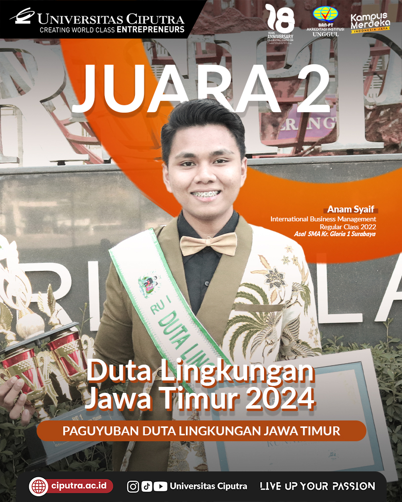 Anam Syaif Mahasiswa IBM RC 2022 berhasil menjadi Duta Lingkungan Jawa Timur 2024 yang diselenggarakan oleh Paguyuban Duta Lingkungan Jawa Timur.