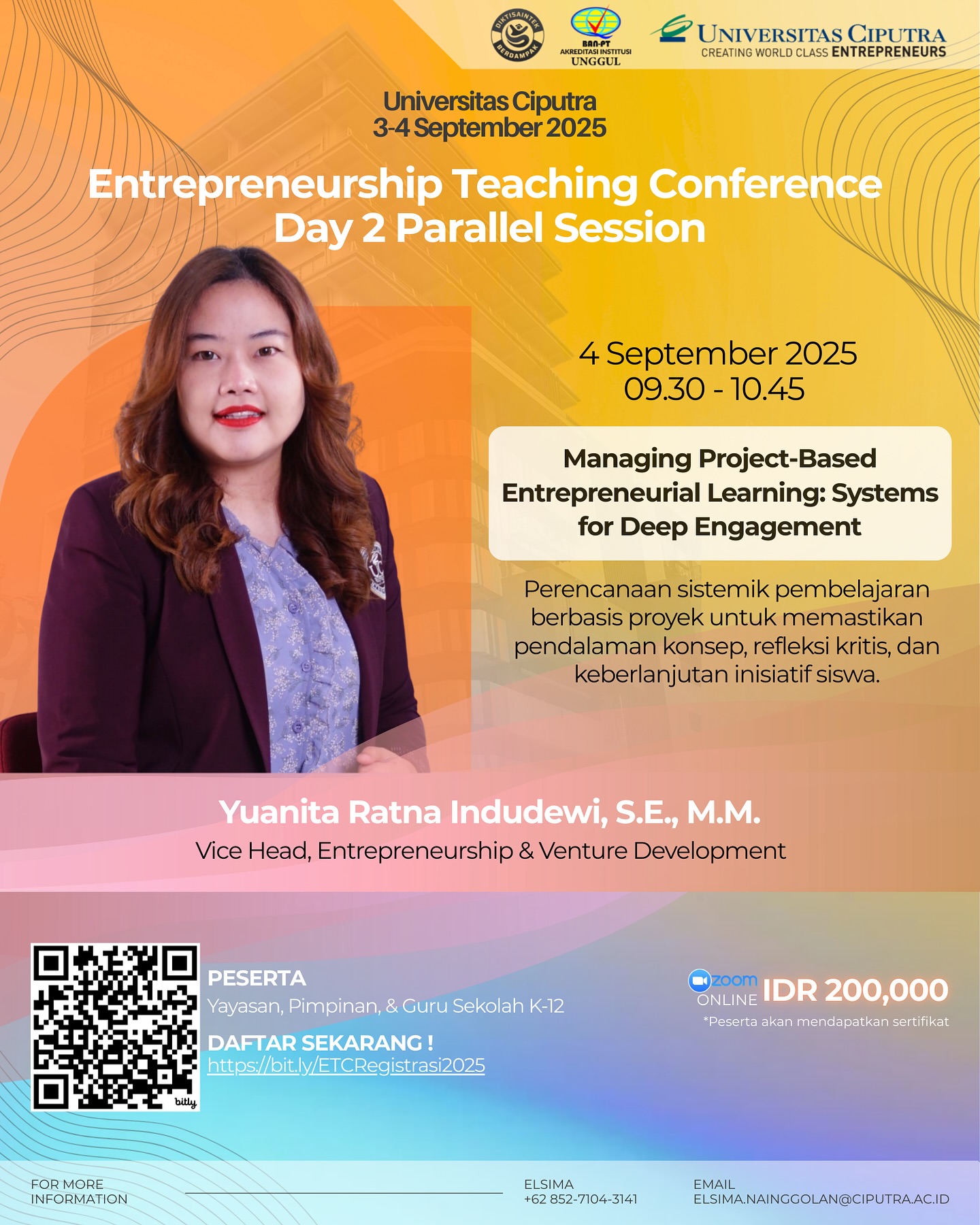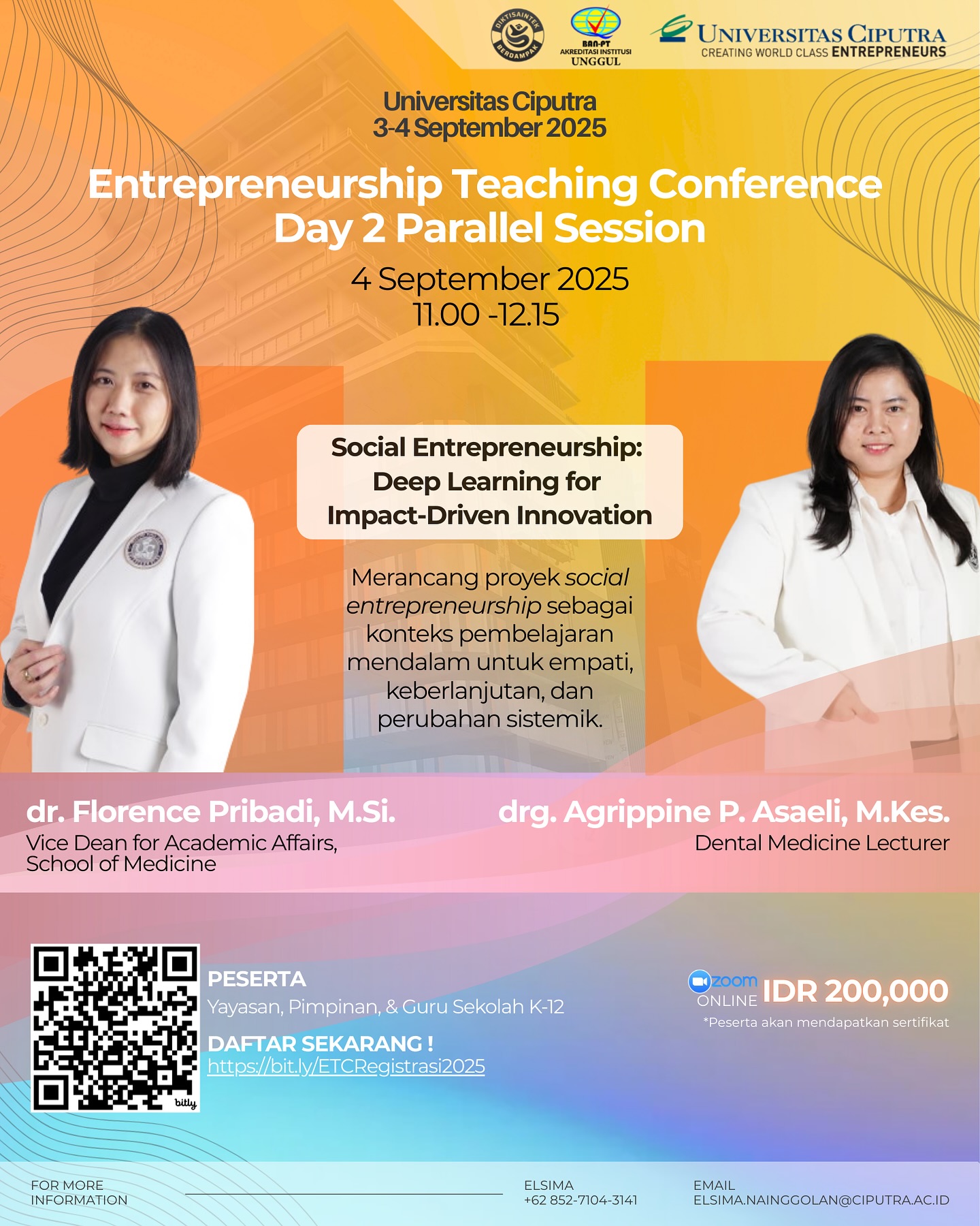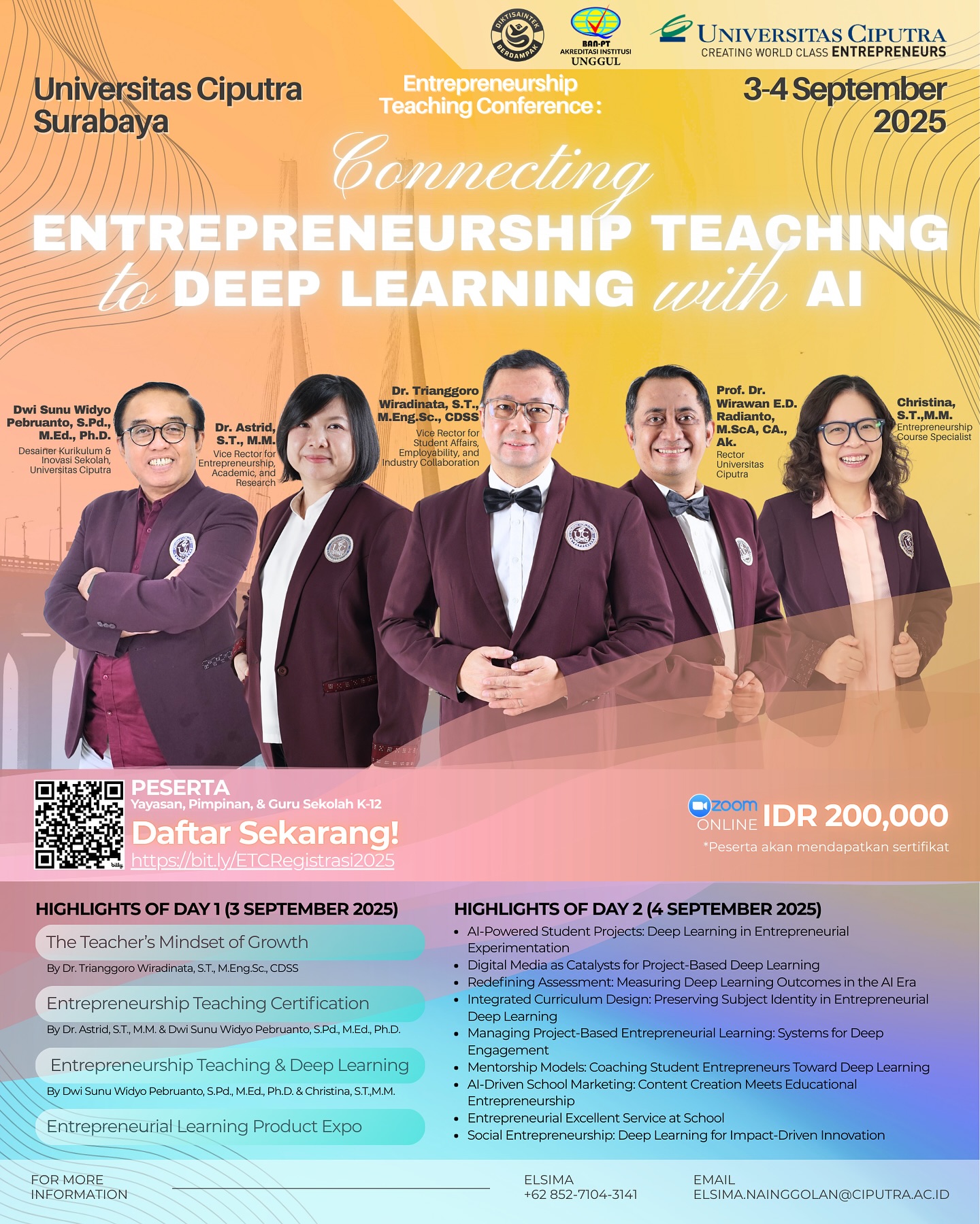 Universitas Ciputra Surabaya has successfully held the Entrepreneurship Teaching Conference (ETC) 2025 on September 3–4, 2025, conducted fully online via Zoom. With the theme “Connecting Entrepreneurship to Deep Learning,” the conference brought together educators, school leaders, and academics to explore the future of entrepreneurship-based education.