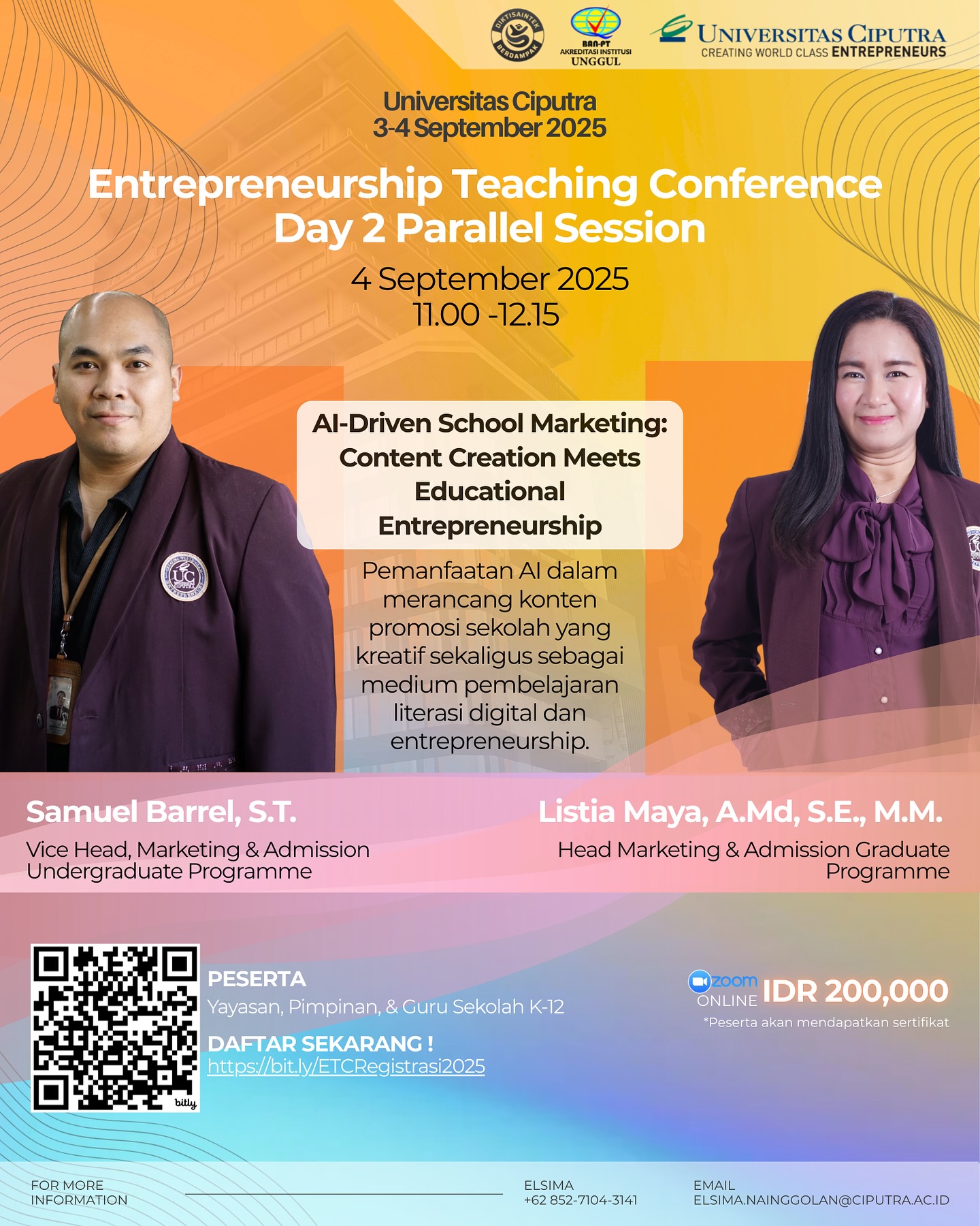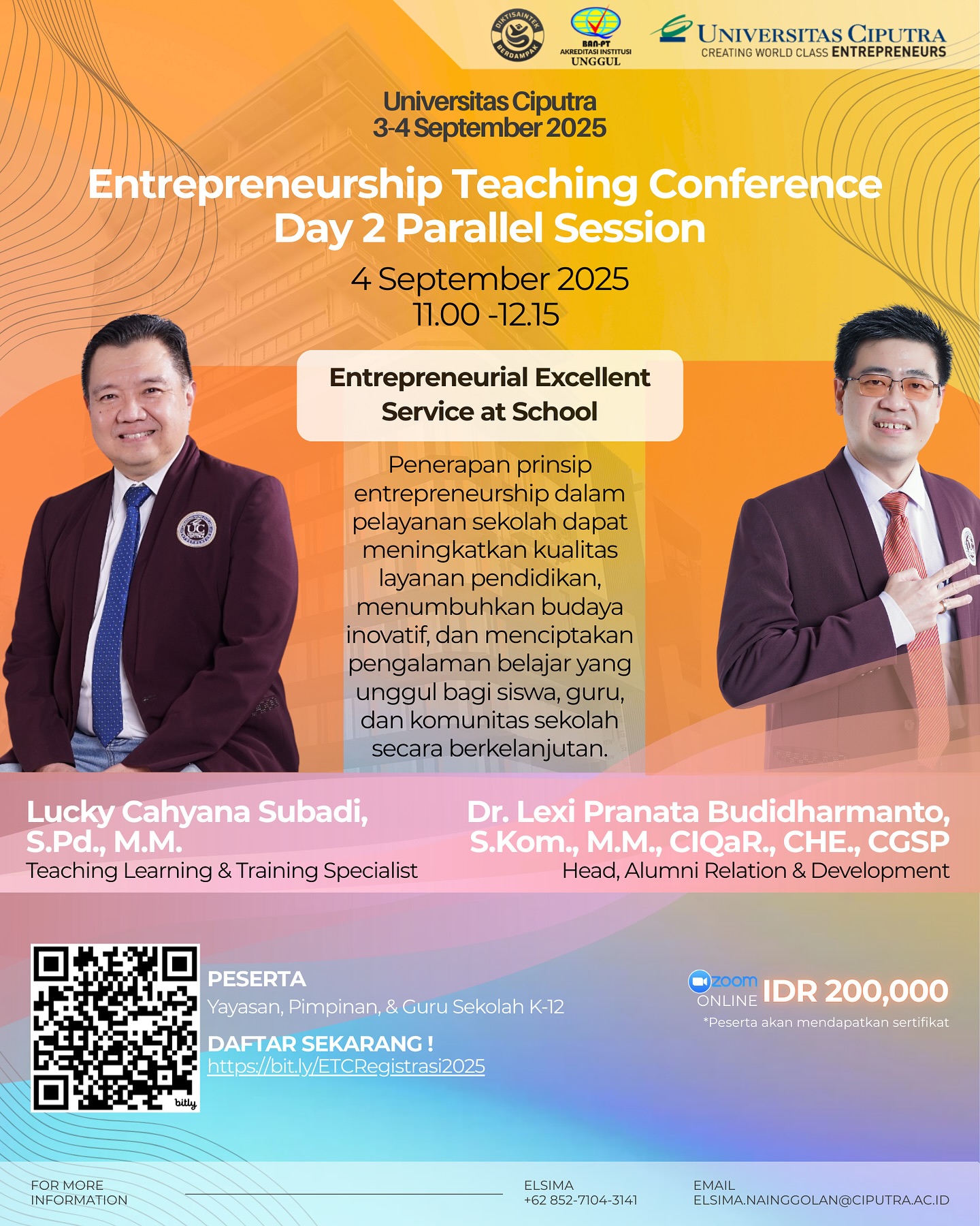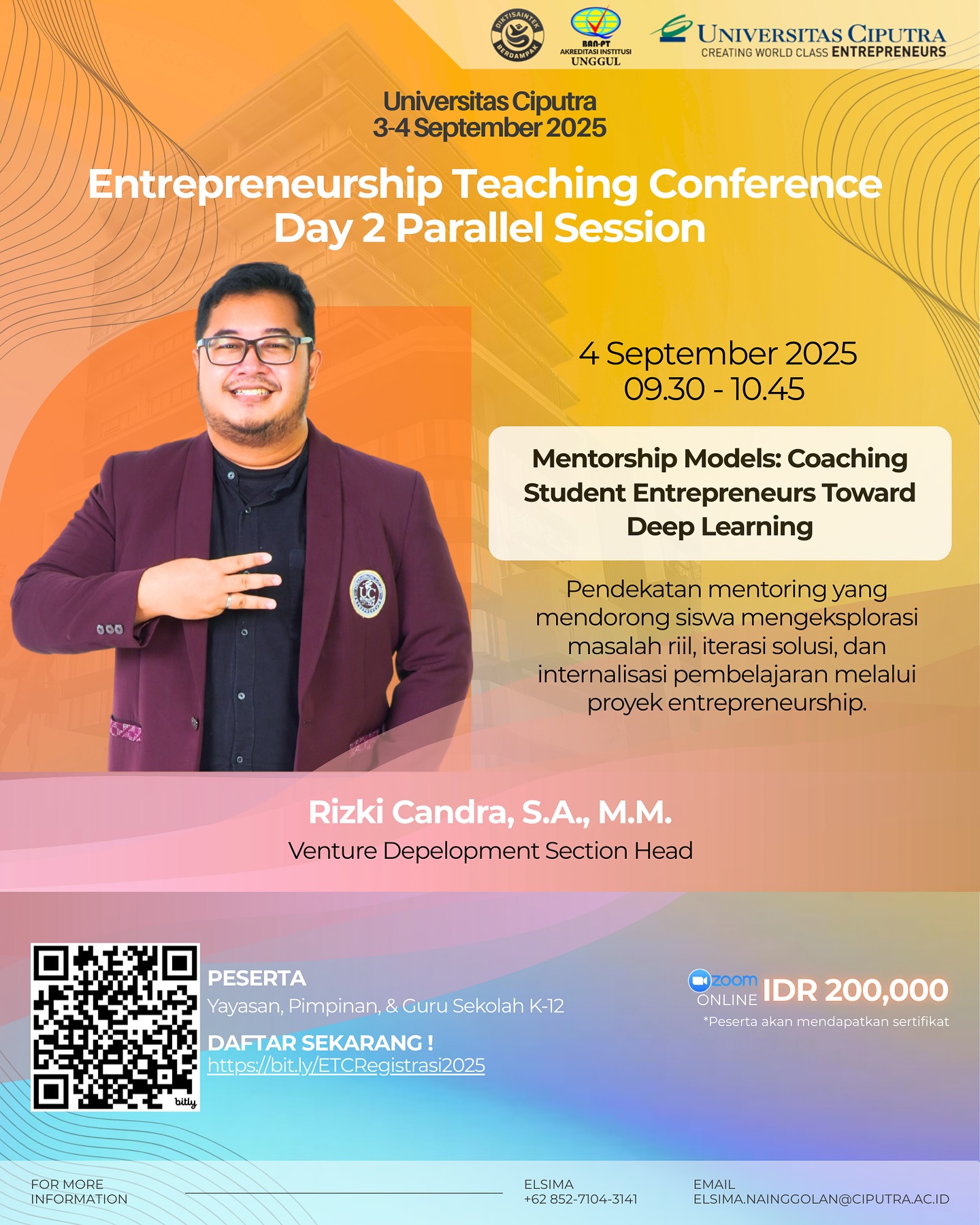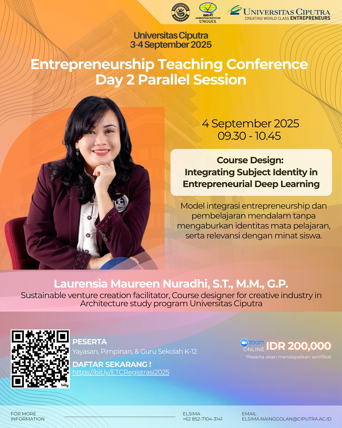 Universitas Ciputra Surabaya has successfully held the Entrepreneurship Teaching Conference (ETC) 2025 on September 3–4, 2025, conducted fully online via Zoom. With the theme “Connecting Entrepreneurship to Deep Learning,” the conference brought together educators, school leaders, and academics to explore the future of entrepreneurship-based education.