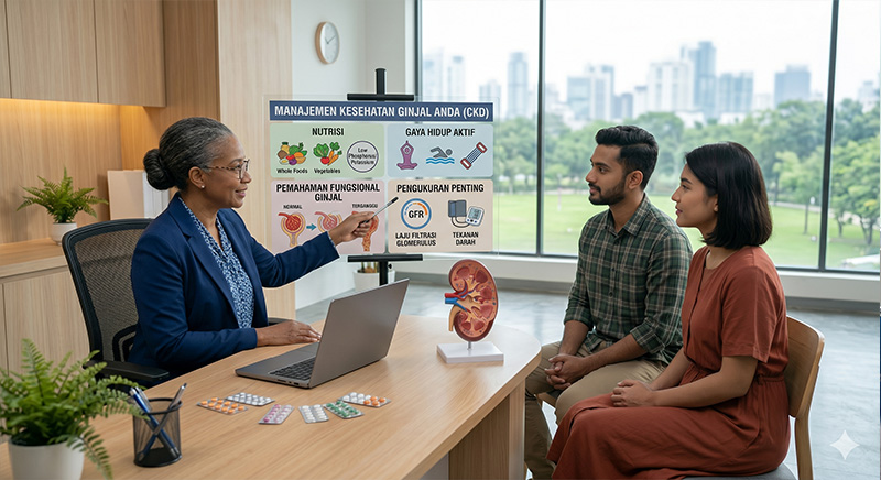 Setelah diagnosis gagal ginjal kronis (CKD) dipastikan melalui pemeriksaan darah dan urine, pasien harus menjalani penanganan medis secara rutin di rumah sakit untuk menjaga sisa fungsi ginjal yang masih ada. Langkah awal yang sangat penting adalah pengendalian ketat terhadap penyakit penyebabnya, seperti memastikan tekanan darah dan kadar gula darah tetap stabil melalui obat-obatan rutin. Pasien juga akan mendapatkan pendampingan dari ahli gizi untuk mengatur pola makan rendah protein, rendah garam, serta pengaturan asupan cairan agar tidak membebani kerja ginjal.