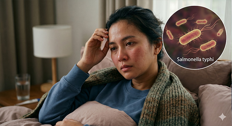 Demam tifoid adalah infeksi  oleh bakteri Salmonella Typhi yang biasanya melalui makanan atau air yang terkontaminasi. Setelah tertelan, bakteri Salmonella Typhi akan bertambah banyak didalam tubuh dan menyebar melalui aliran darah.