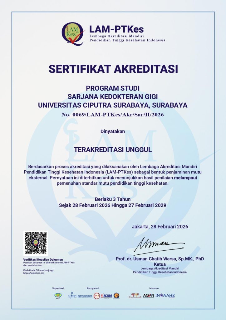 Fakultas Kedokteran Gigi (FKG) Universitas Ciputra kembali mengukir prestasi gemilang dengan keberhasilannya meraih predikat “Terakreditasi Unggul” untuk Program Studi Pendidikan Sarjana dan Profesi Dokter Gigi. Pencapaian prestisius ini merupakan buah manis dari proses penilaian ketat yang dilaksanakan pada tanggal 9 hingga 12 Februari 2026, yang membuktikan bahwa standar kualitas pendidikan, fasilitas, serta kurikulum yang diterapkan telah memenuhi ekspektasi tertinggi nasional. Dengan status akreditasi tertinggi ini, FKG Universitas Ciputra semakin mengukuhkan posisinya sebagai institusi pendidikan kedokteran gigi papan atas yang siap mencetak dokter gigi profesional berjiwa entrepreneur yang kompeten dan inovatif bagi masa depan Indonesia.