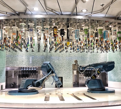 Sementara itu, sejumlah bar yang ada di kapal menambah kesan dan pengalaman mendalam selama berpesiar. Pertama, Schooner Bar, menyajikan snack ringan sambil disantap dengan berenang. Bar ini menyajikan cocktail campuran yang sempurna untuk berkumpul sambil mendengarkan alunan piano. Kedua, Boleros Bar, di sini anda dapat menari dan berdansa setelah makan malam atau setelah pesta. Band dan penyanyi yang menyanyikan lagu berirama latin, salsa, cumbia, merengue dan samba secara live, membuat anda langsung bergerak. Ketiga, North Star Bar, di bar ini anda dapat meminum cocktail dengan pemandangan laut. Naikkan gelas ke pemandangan setinggi langit. Di sini menampilkan pemandangan 360º yang brilian dari 300 kaki di atas permukaan laut tropis. Keempat, Sunshine Bar, terletak di Solarium Restaurant, memiliki menu menggoda, seperti jus detoks, smoothie antioksidan, smoothie protein. Untuk mengonsumsi alkohol, anda harus berusia 21+. Kelima, Two70 Lounge, bar ini pada malam hari akan mematikan lampu, jendela akan menjadi layar dan ruang menjadi hidup dengan sorotan cahaya warna-warni, DJ dan live bar. Keenam, Bionic Bar, yang menggabungkan mixology dengan teknologi. Gerakan bergoyang bersama racikan liquor, soda, air dan juga es batu dengan alkohol di cangkir anda. Dua bartender robot mengetahui secara benar dan tepat cara mengocok, mengaduk, dan mengayunkan kombinasi cocktail lezat. Menu yang tersedia terdiri dari martini gin klasik dan es teh long island, hingga pesanan khusus sesuai keinginan anda. Hanya menekan tombol pada layar tab yang tersedia dan memilih menu yang anda inginkan, maka robot akan mulai memainkan atraksinya di depan anda dan menyajikannya dengan tepat di hadapan anda.