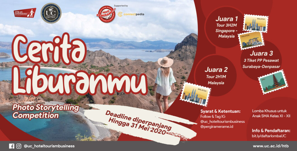 – Lomba ini berlangsung mulai tanggal 1 April 2020 hingga 31 Mei 2020 – Foto dan ceritamu akan ditayangkan di website Fakultas Pariwisata Universitas Ciputra – htb.uc.ac.id /lihat di menu Photo Competition)
