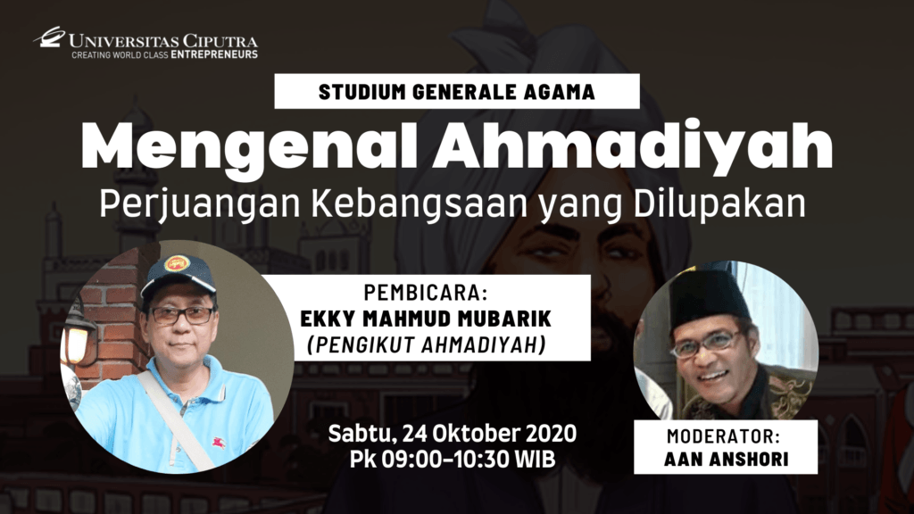 October 30, 2020 Salah satu kelompok Agama Islam yang tersingkir dan terlupakan karena ajarannya dianggap sesat berdasarkan Fatwa MUI 1980 dan 2005 adalah Ahmadiyah. Melalui studium generale yang diadakan oleh Fakultas Entrepreneurship dan Humaniora Universitas Ciputra Surabaya pada Sabtu, 24 Oktober 2020 mengundang Bapak Ekky Mubarik sebagai narasumber dari Jama’ah Ahmadiyah Indonesia dan Bapak Aan […]