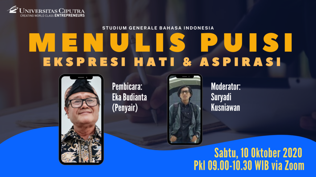 Ada yang berbeda dari studium generale Bahasa Indonesia yang diadakan pada Sabtu, 10 Oktober 2020 oleh Fakultas Entrepreneurship dan Humaniora Universitas Ciputra Surabaya. Studium generale dengan topik menulis puisi, ekspresi hati dan aspirasi tidak hanya mengajarkan mahasiswa untuk menyajikan puisi dengan baik dan benar tetapi juga mengulas seputar poetrypreneur. Bersama Pak Eka Budianta seorang penyair dan kritikus sastra sebagai pembicara serta Pak Suryadi Kusniawan sebagai moderator. Para mahasiswa dibawa menuju pandangan yang baru mengenai puisi sebagai produk kebudayaan dan bahasa milik masyarakat.