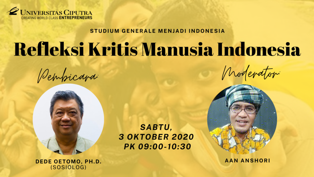 Sabtu, 3 Oktober 2020, Fakultas Entrepreneurship dan Humaniora Universitas Ciputra Surabaya menggelar studium generale Becoming Indonesia melalui Zoom dan live streaming Youtube. Pada studium generale kali ini, Pak Dede Oetomo seorang sosiolog dan Aktivis HAM di Indonesia sebagai pembicara dan Gus Aan Anshori sebagai moderator membawakan topik refleksi kritis manusia Indonesia. Para mahasiswa dan dosen yang hadir diajak berdiskusi mengenai berpikir kritis dalam menjadi Indonesia. Lantas Bagaimana cara kita menjadi Indonesia?