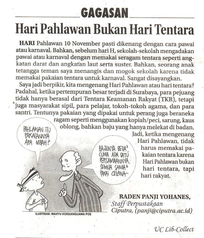 Saya jadi berpikir, kita mengenang Hari Pahlawan atau hari tentara? Padahal, ketika pertempuran besar terjadi di Surabaya, para pejuang tidak hanya berasal dari Tentara Keamanan Rakyat (TKR), tetapi juga masyarakat sipil, para pelajar, tokoh-tokoh agama, dan para santri. Tentunya pakaian yang dipakai untuk perang juga beraneka ragam seperti menggunakan kopiah/peci, sarung, kaus oblong, bahkan baju yang hanya melekat di badan. Jadi, ketika mengenang Hari Pahlawan, tidak harus memakai pakaian tentara karena Hari Pahlawan bukan hari tentara, tapi hari rakyat.