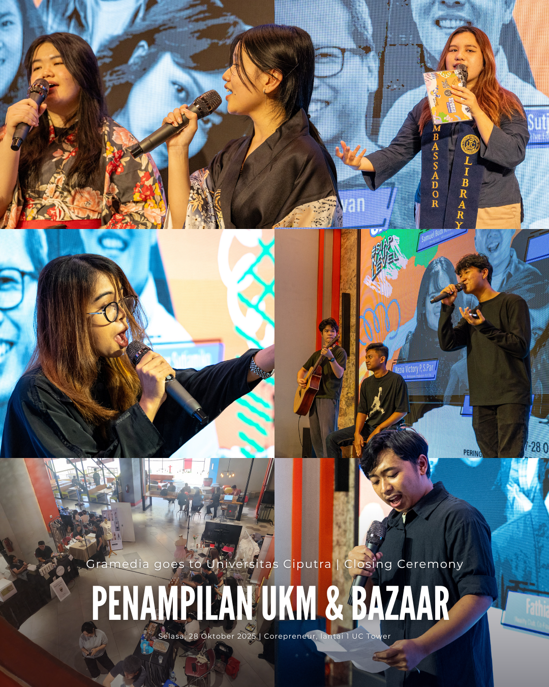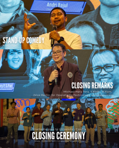 Acara Gramedia x Danamon Goes to Campus 2025 di Universitas Ciputra Surabaya resmi ditutup dengan penuh semangat dan warna melalui sesi Closing Ceremony yang berlangsung meriah di UC Main Building pada Selasa, 28 Oktober 2025. Rangkaian penutupan ini dimulai dengan sambutan hangat dari Kuncoro Cahyani G. (Caca) selaku MC dan UC Library Ambassador, yang kemudian dilanjutkan dengan berbagai penampilan kreatif dari UKM Universitas Ciputra — mulai dari UKM Teater, UKM Japanese Culture, hingga UKM Band Resonance, yang menampilkan energi muda dan semangat berkarya khas mahasiswa UC. Suasana semakin hidup saat sesi Stand Up Comedy dari Andri Bajul menghadirkan tawa dan keakraban di antara peserta, menjadi penutup ringan setelah dua hari penuh inspirasi dan pembelajaran. Puncak acara ditandai dengan Closing Remarks oleh Michael Hery Tera, S.Kom., M.Kom., selaku Vice Rector for Operations, Technology, and Resources Universitas Ciputra. Dalam sambutannya, beliau menyampaikan apresiasi kepada Gramedia dan Danamon atas kolaborasi luar biasa ini, serta menegaskan pentingnya sinergi antara dunia pendidikan dan industri kreatif dalam menumbuhkan generasi muda yang adaptif, inovatif, dan berdaya saing. Acara ini menjadi momentum indah untuk menutup perayaan Bulan Bahasa dan Sastra serta Hari Sumpah Pemuda 2025, sekaligus meneguhkan komitmen Universitas Ciputra untuk terus menghadirkan ruang belajar yang inspiratif bagi sivitas akademika.