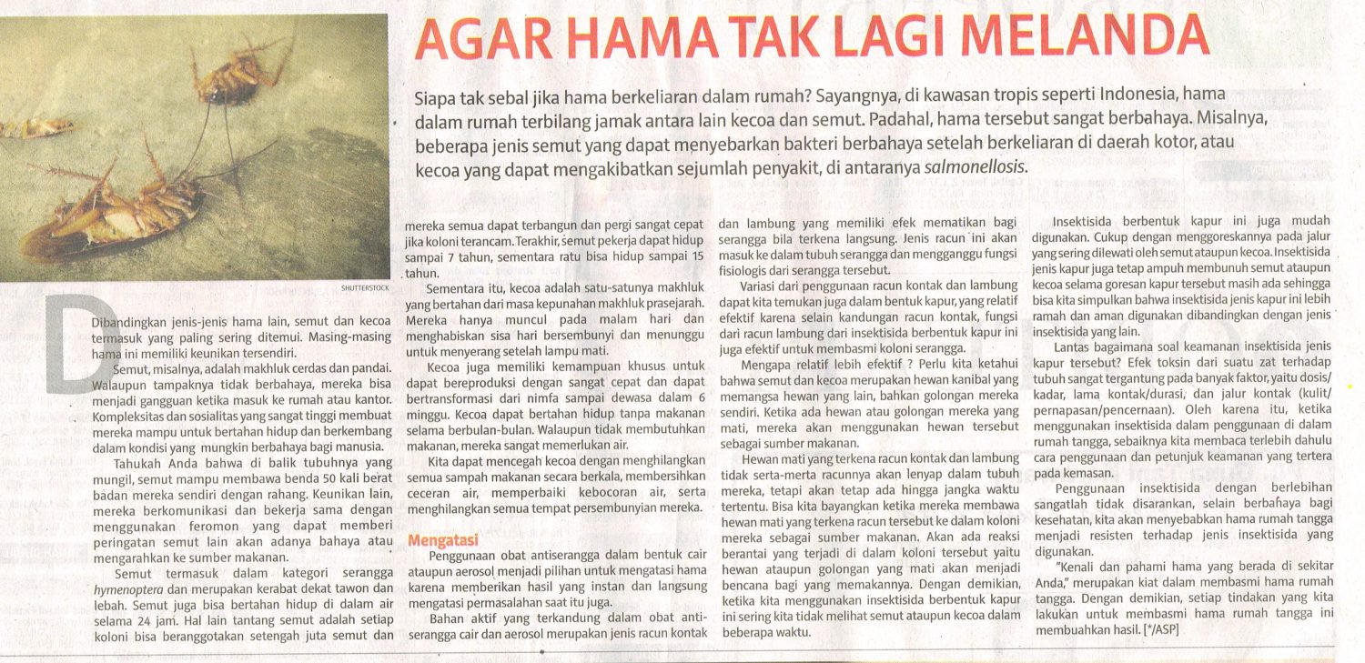 “Kenali dan pahami hama yang berada di sekitar Anda,” merupakan kiat dalam membasmi hama rumah tangga. Dengan demikian, setiap tindakan yang kita lakukan untuk membasmi hama rumah tangga ini membuahkan hasil. [*/ASP]