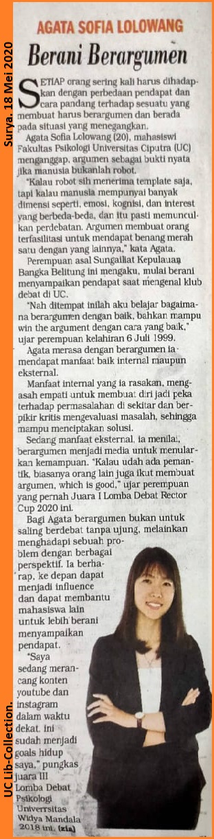 Bagi Agata berargumen bukan untuk saling berdebat tanpa ujung, melainkan menghadapi sebuah problem dengan berbagai prespektif. Ia berharap, ke depan dapat menjadi influence dan dapat membantu mahasiswa lain untuk lebih berani menyampaikan pendapat.