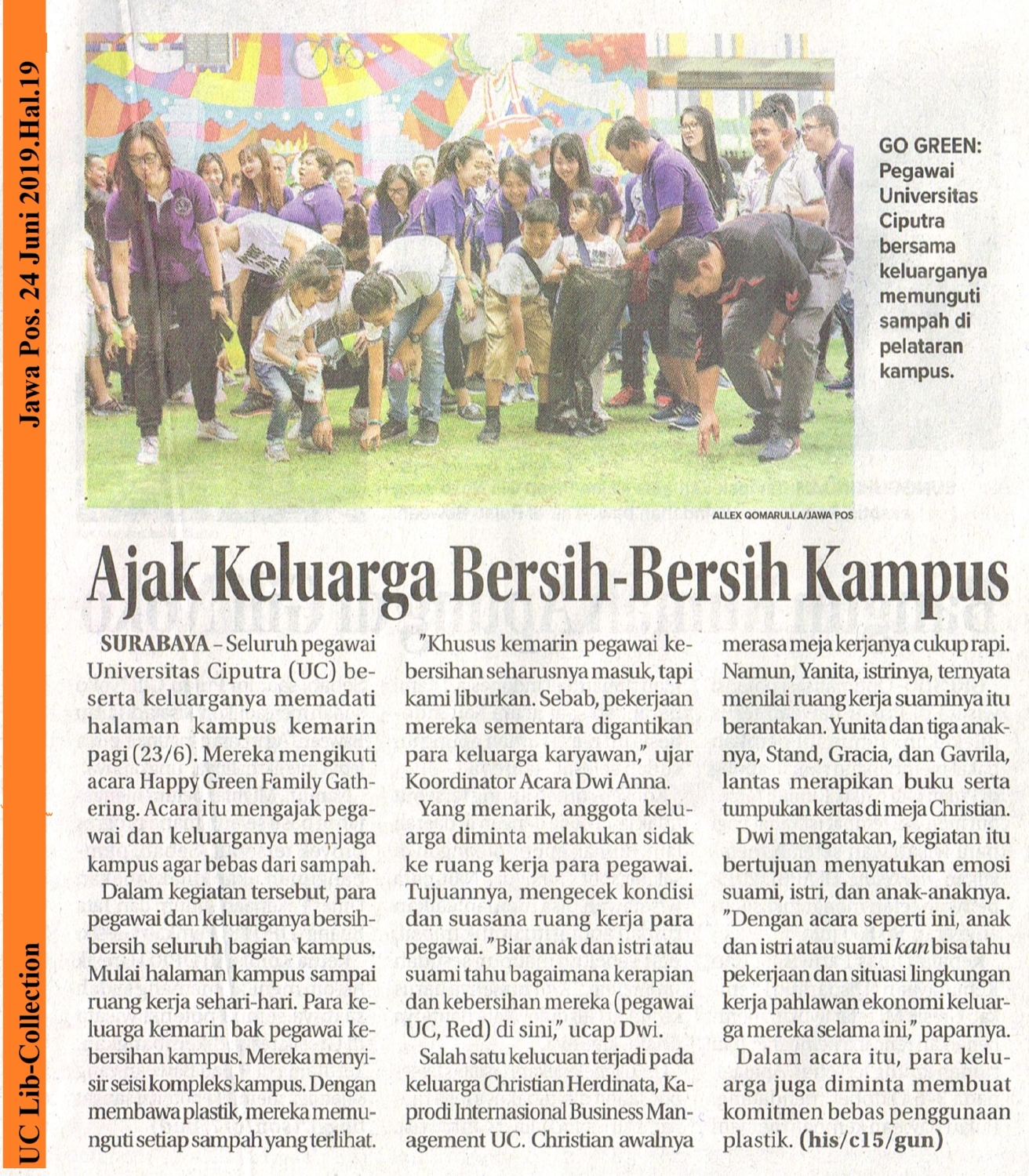 Surabaya – seluruh pagawai Universitas Ciputra (UC) beserta keluarganya memadati halaman kampus kemarin pagi (23/6). Mereka mengikuti acara Happy Green Family Gathering. Acara itu mengajak pegawai dan keluarganya menjaga kampus agar terbebas dari sampah.