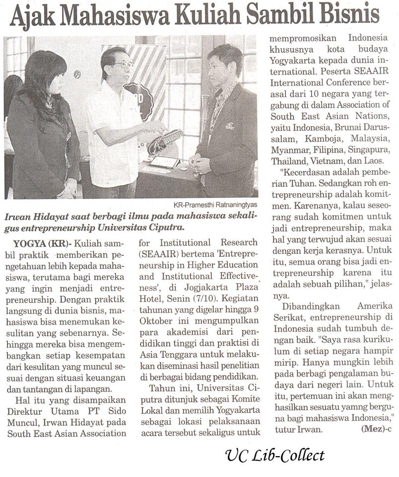Hal itu yang disampaikan Direktur Utama PT Sido Muncul, Irwan Hidayat pada South East Asian Association for Institutional Research (SEAAIR) bertema ‘Entrepreneurship in Higher Education and Institutional Effectiveness’, di Jogjakarta Plaza Hotel, Senin (7/10). Kegiatan Tahunan yang digelar hingga 9 Oktober ini mengumpulkan para akademisi dari pendidikan tinggi dan praktisi di Asia Tenggara untuk melakukan diseminasi hasil penelitian di berbagai bidang pendidikan.
