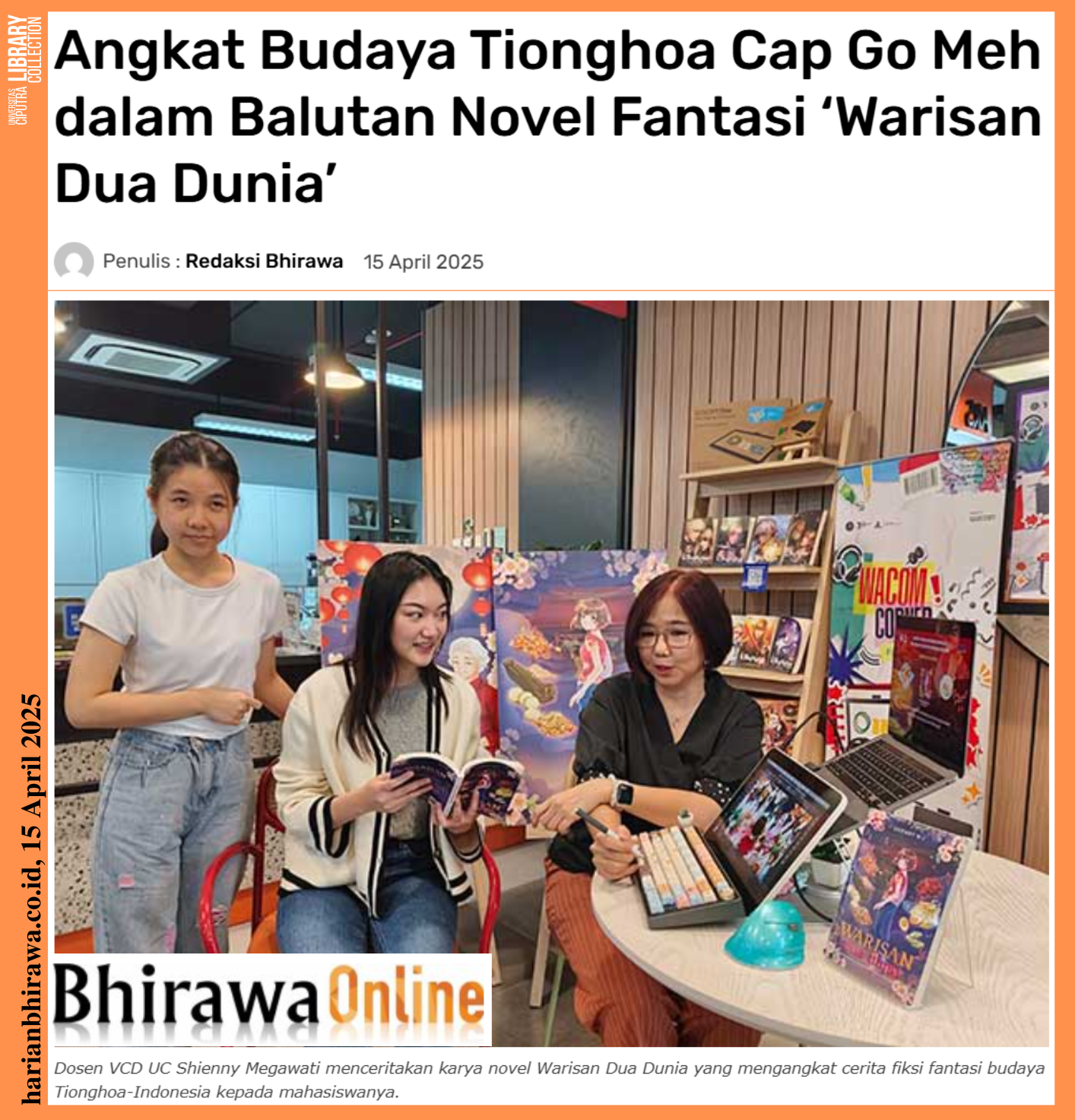 Dosen Visual Communication Desaign di Universitas Ciputra (VCD UC) Dr. Shienny Megawati Sutanto, S.Sn., M.M., M.Ds., luncurkan karya novel fantasi terbaru berjudul Warisan Dua Dunia. Karya ini bercerita tentang warisan budaya Tionghoa-Indonesia, khususnya tradisional Lontong Cap Go Meh.