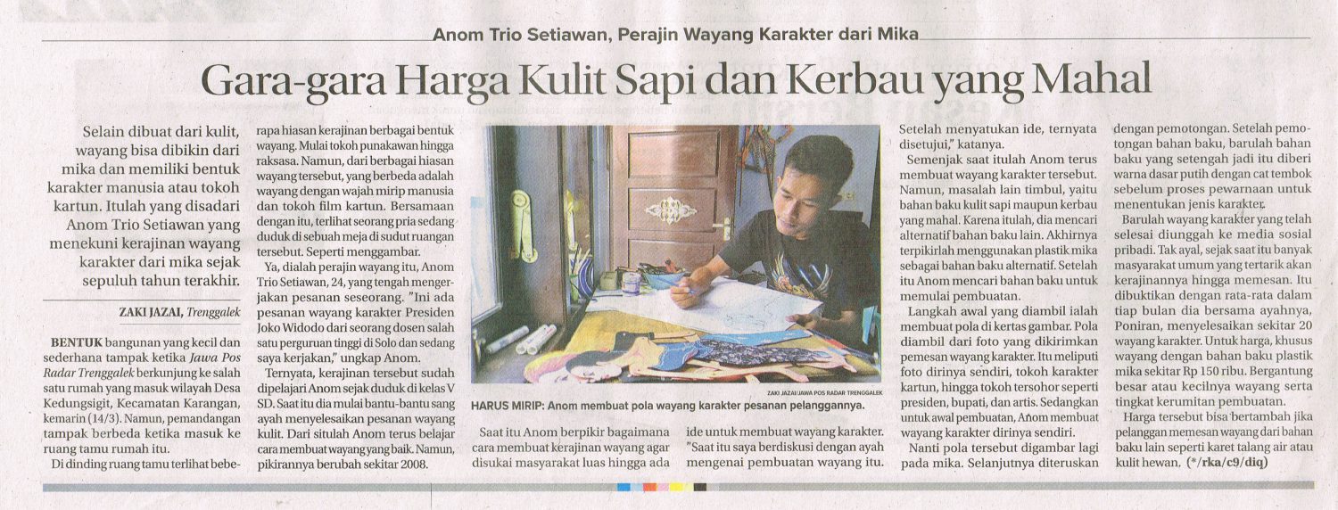 Ya, dialah perjanin wayang itu, Anom Trio Setiawan, 24, yang tengah mengerjakan pesanan seseorang. “Ini ada pesanan wayang karakter Presiden Joko Widodo dari seorang dosen salah satu perguruan tinggi di Solo dan sedang saya kerjakan,” ungkap Anom.