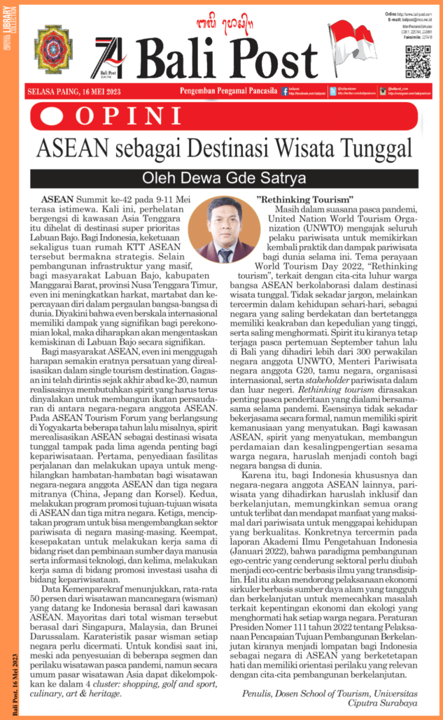 Masih dalam suasana pasca pandemi, United Nation World Tourism Organization (UNWTO) mengajak seluruh pelaku pariwisata untuk memikirkan kembali praktik dan dampak pariwisata bagi dunia selama ini. Tema perayaan World Tourism Day 2022, “Rethinking tourism”, terkait dengan cita-cita luhur warga bangsa ASEAN berkolaborasi dalam destinasi wisata tunggal. Tidak sekadar jargon, melainkan tercermin dalam kehidupan sehari-hari, sebagai negara yang saling berdekatan dan bertetangga memiliki keakraban dan kepedulian yang tinggi, serta saling menghormati. Spirit itu kiranya tetap terjaga pasca pertemuan September tahun lalu di Bali yang dihadiri lebih dari 300 perwakilan negara anggota UNWTO, Menteri Pariwisata negara anggota G20, tamu negara, organisasi internasional, serta stakeholder pariwisata dalam dan luar negeri. Rethinking tourism dirasakan penting pasca penderitaan yang dialami bersama-sama selama pandemi. Esensinya tidak sekadar bekerjasama secara formal, namun memiliki spirit kemanusiaan yang menyatukan. Bagi kawasan ASEAN, spirit yang menyatukan, membangun perdamaian dan kesalingpengertian sesama warga negara, haruslah menjadi contoh bagi negara bangsa di dunia.