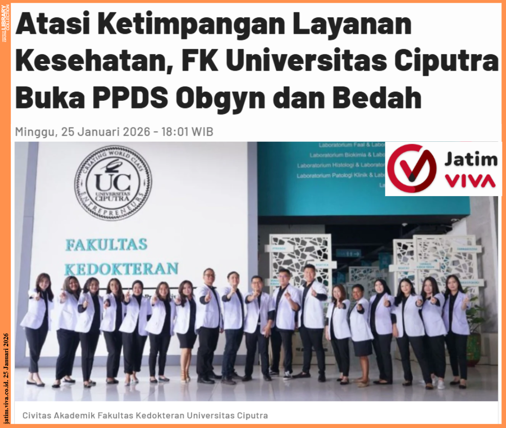 Surabaya, VIVA Jatim – Fakultas Kedokteran Universitas Ciputra (FK UC) kian memperkuat kontribusinya dalam dunia kesehatan nasional. Terbaru, FK UC resmi memperoleh izin pembukaan Program Pendidikan Dokter Spesialis (PPDS) untuk dua bidang strategis, yakni Spesialis Obstetri dan Ginekologi (Obgyn) serta Spesialis Bedah, dengan penekanan pada penguasaan teknologi medis modern.
