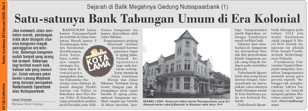 Sejarah di Balik Megahnya Gedung Nutsspaarbank (1)_Satu satunya Bank Tabungan Umum di Era Kolonial. Radar Surabaya. 20 Februari 2020. Hal.3