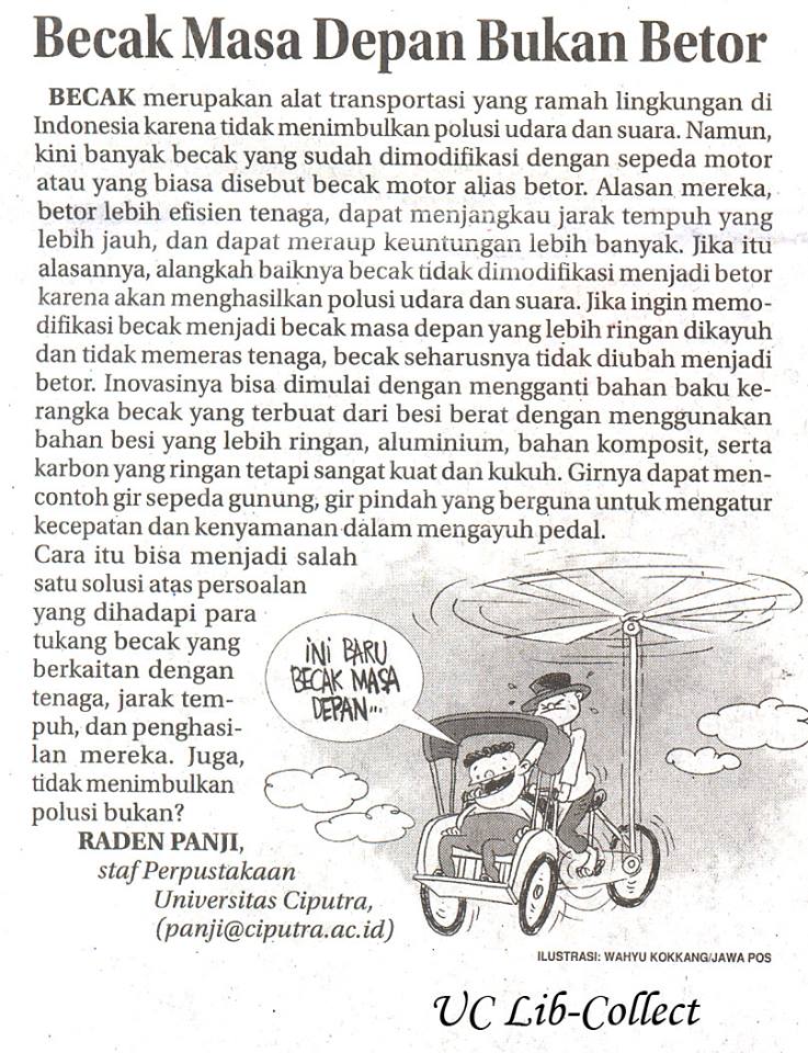 BECAK merupakan alat transportasi yang ramah lingkungan di Indonesia karena tidak menimbulkan polusi udara dan suara. Namun, kini banyak becak yang sudah dimodofikasi dengan sepeda motor atau yang biasa disebut becak motor alais bettor. Alasan mereka, bettor lebih efesien tenaga, dapat menjangkau jarak tempuh yang lebih jauh, dan dapat meraup keuntungan lebih banyak. Jika itu alasannya, alangkah baiknya becak tidak dimodifikasikan bettor karena akan menghasilkan polusi udara dan suara. Jika ingin memodifikasi becak menjadi becak masa depan yang lebih ringan dan tidak terlalu menguras tenaga, becak seharusnya tidak diubah menjadi betor. Inovasinya bisa dimulai dengan mengganti bahan baku dengan rangka becak yang terbuat dari besi berat dengan menggunakan bahan besi yang lebih ringan, aluminium, bahan komposit serta karbon yang ringan tetapi sangat kuat dan kukuh. Gir nya dapat mencontoh gir sepeda gunung, gir pindah yang berguna untuk mengatur kecepatan dan kenyamanan dalam mengayuh pedal. Cara itu akan menjadi solusi atas persoalan yang dihadapi para tukang becak yang berkaitan dengan tenaga, jarak tempuh,dan pengasilan mereka. Juga tidak menimbulkan polusi bukan?