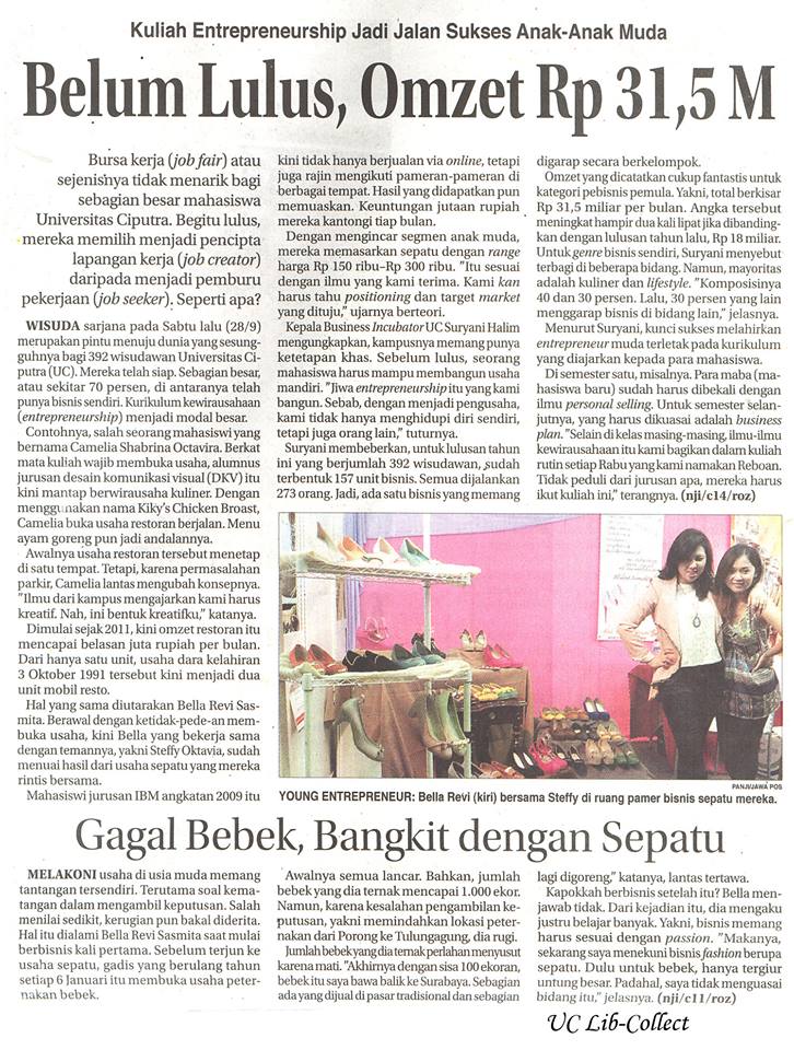 Kepala Business Incubator UC Suryani Halim mengungkapkan, kampusnya memang punya ketetapan khas. Sebelum lulus, seorang mahasiswa harus mampu membangun usaha mandiri. “Jiwa entrepreneurship itu yang kami bangun. Sebab, dengan menjadi pengusaha, kami tidak hanya menghidupi diri sendiri, tetapi juga orang lain,” tuturnya.