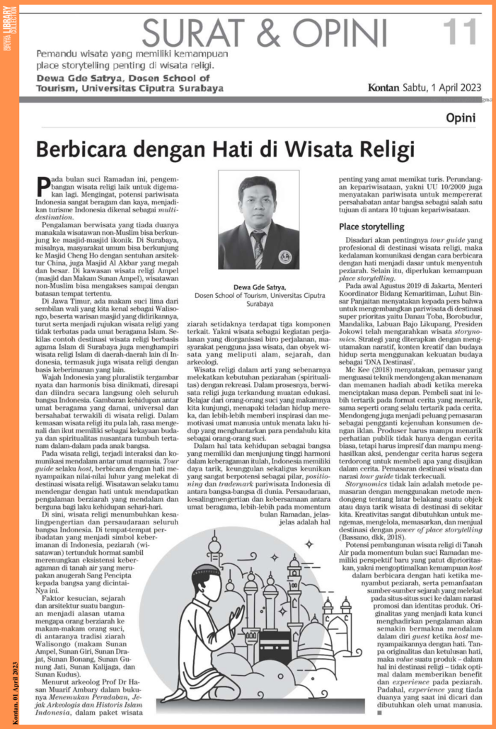 Potensi pembangunan wisata religi di Tanah Air pada momentum bulan suci Ramadan memiliki perspektif baru yang patut diprioritaskan, yakni mengoptimalkan kemampuan host dalam berbicara dengan hati ketika menyambut peziarah, serta pemanfaatan sumber-sumber sejarah yang melekat pada situs-situs suci ke dalam narasi promosi dan identitas produk. Originalitas yang menjadi kata kunci menghadirkan pengalaman akan semakin bermakna mendalam dalam diri guest ketika host menyampakannya dengan hati. Tanpa originalitas dan ketulusan hati, maka value suatu produk-dalam hal ini destinasi religi tidak optimal dalam memberikan benefit dan erperience pada peziarah. Padahal, experience yang tiada duanya yang saat ini dicari dan dibutuhkan oleh umat manusia.