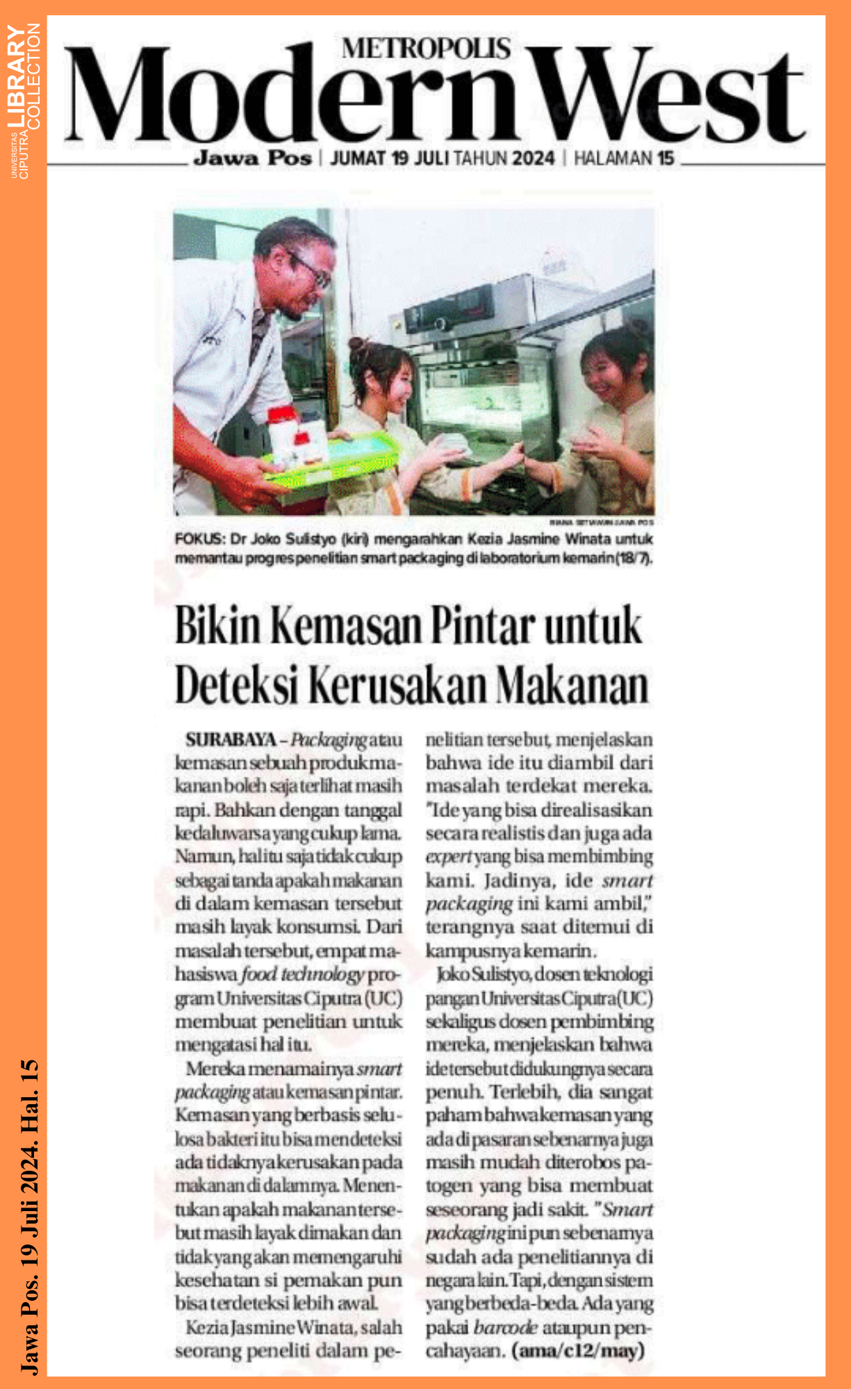 SURABAYA – Packaging atau kemasan sebuah produk makanan boleh saja terlihat masih rapi. Bahan dengan tanggal kadaluarsa yang cukup lama. Namun, hal itu saja tidak cukup sebagai tanda apakah makanan di dalam kemasan tersebut masih layak dikonsumsi. Dari masalah tersebut, empat mahasiswa food technology program Universitas Ciputra (UC) membuat penelitian untuk mengatasi hal itu.