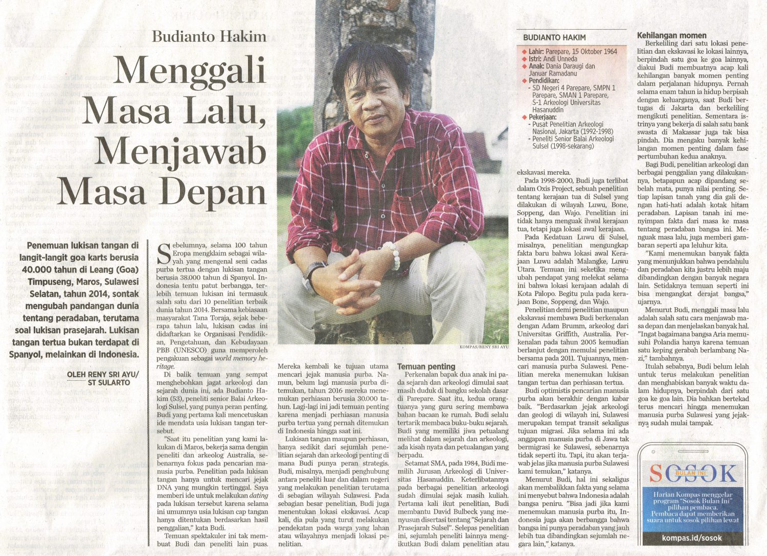 Di balik tuntuan yang simpat menghebohkan jagut arkeologi dan sejarah dunia ini , ada Budianto Ha- Idim ( 5.3 ) . peneliti senior Baloi Arkeo log Sulsel , yang punya peran penting Budi yang pertama kali mencetuskan Ide mendata usia lukisan tangan ter- sebut.