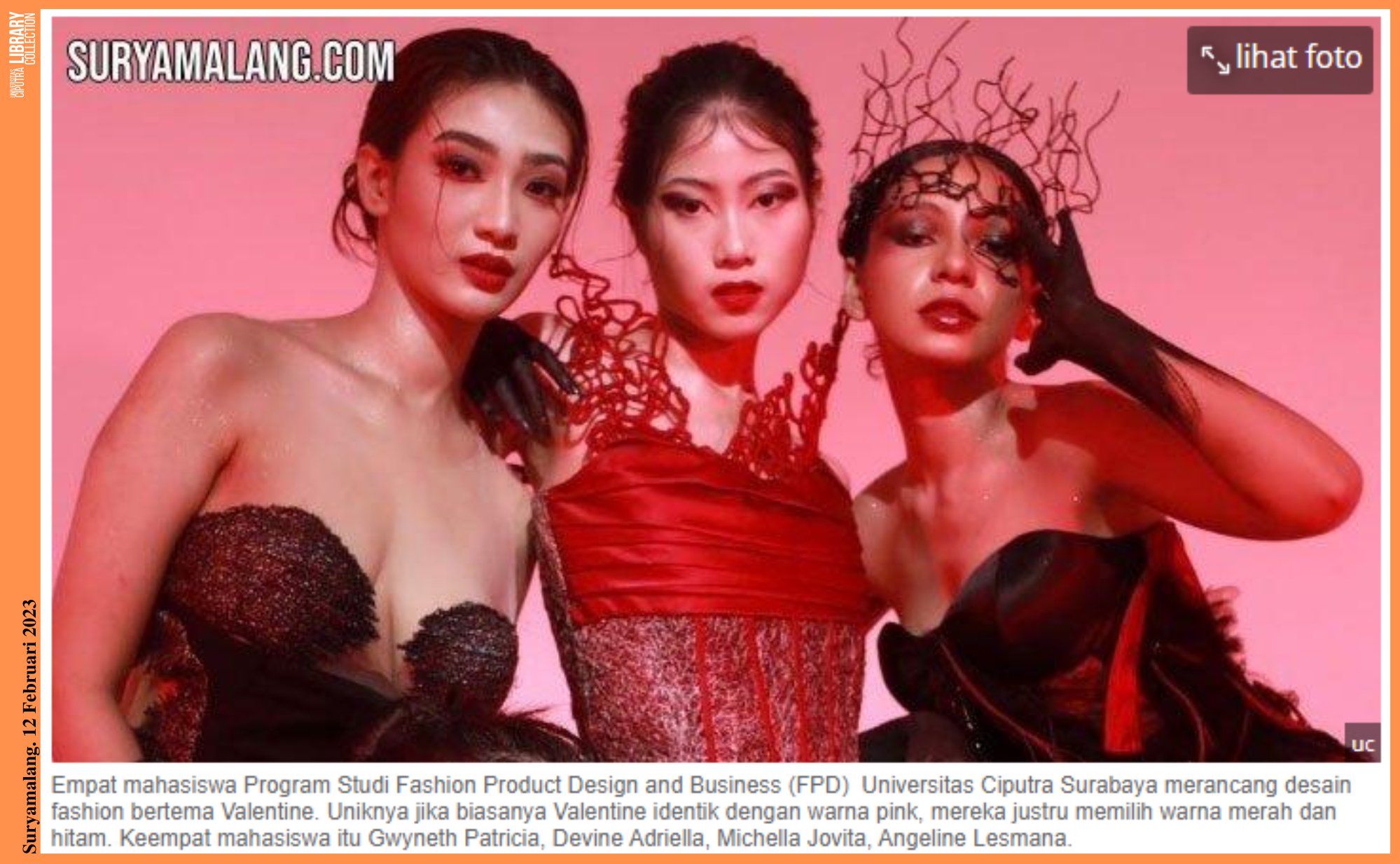 SURYAMALANG.COM, SURABAYA – Empat mahasiswa Program Studi Fashion Product Design and Business (FPD)  Universitas Ciputra Surabaya merancang desain fashion bertema Valentine.