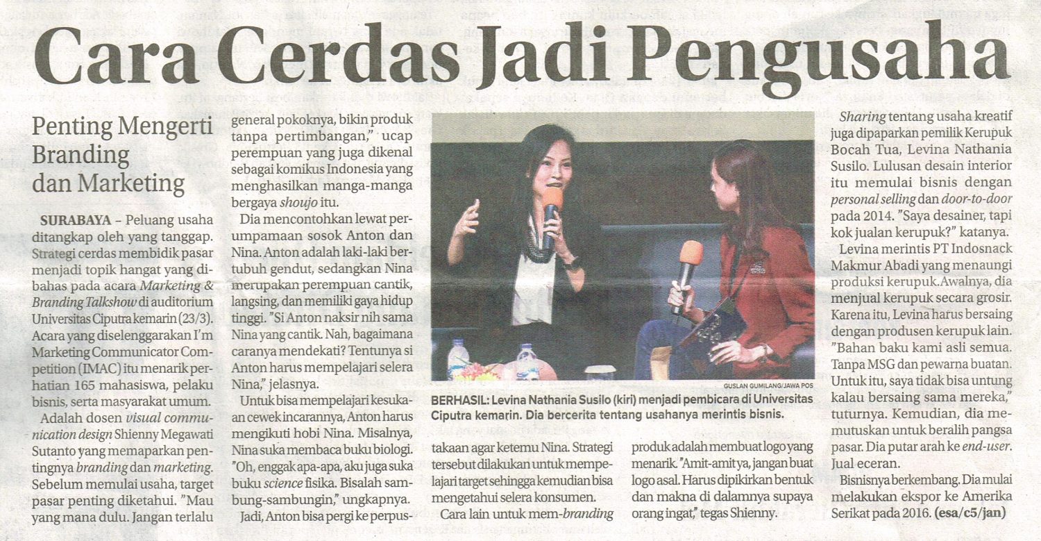 SURABAYA – Peluang usaha ditangkap oleh yang tanggap. Strategi cerdas membidik pasar menjadi topik hangat yang dibahas pada acara Marketing & Branding Talkshow di auditorium Universitas Ciputra kemarin (23/3). Acara yang diselenggarakan I’m Marketing Communicator Competition (IMAC) itu menarik perhatian 165 mahasiswa, pelaku bisnis, serta masyarakat umum.