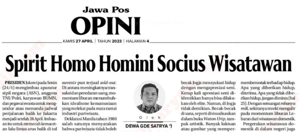 Spirit Homo Homoni Socius Wisatawan. Jawa Pos. 27 April 2023. Hal. 4