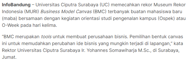 UC Surabaya Pecahkan Rekor MURI BMC Terbanyak Buatan Mahasiswa Barujatim.antarnews.com. 1 September 2023