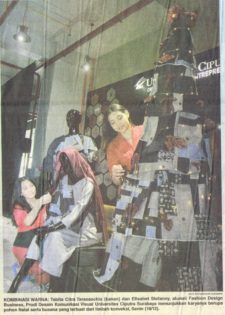 Pohon Natal dan Replika Baju Keluarga Kudus. Habiskan Empat Karung Limbah Konveksi. Radar Surabaya. 19 Desember 2023. Hal.6