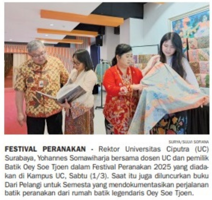 Universitas Ciputra Rayakan 100 Tahun Batik Peranakan Oey Soe Tjoen. Berharap Generasi Muda Lestarikan Batik. Surya. 3 Maret 2024. Hal.1,11