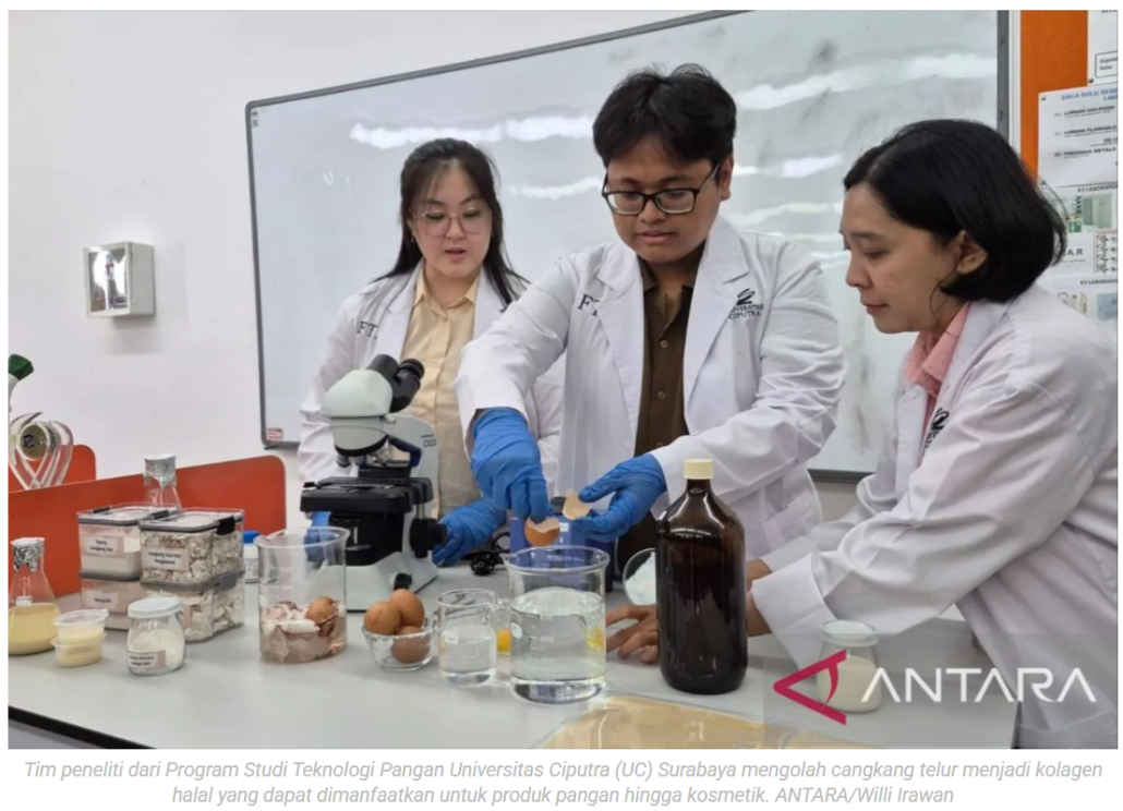 Tim Peneliti Universitas Ciputra olah cangkang telur jadi kolagen halal. jatim.antaranews.com. 3 Februari 2026
