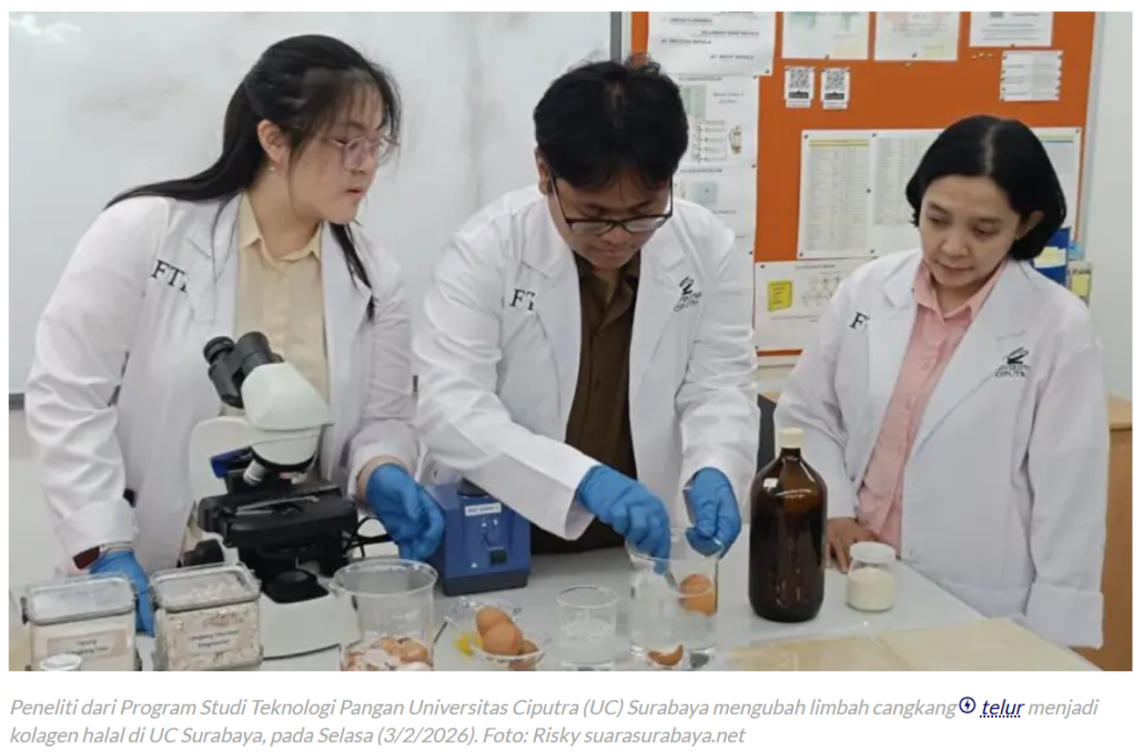 Kolagen Halal dari Limbah Telur, Inovasi Peneliti UC Surabaya. www.suarasurabaya.net. 3 Februari 2026