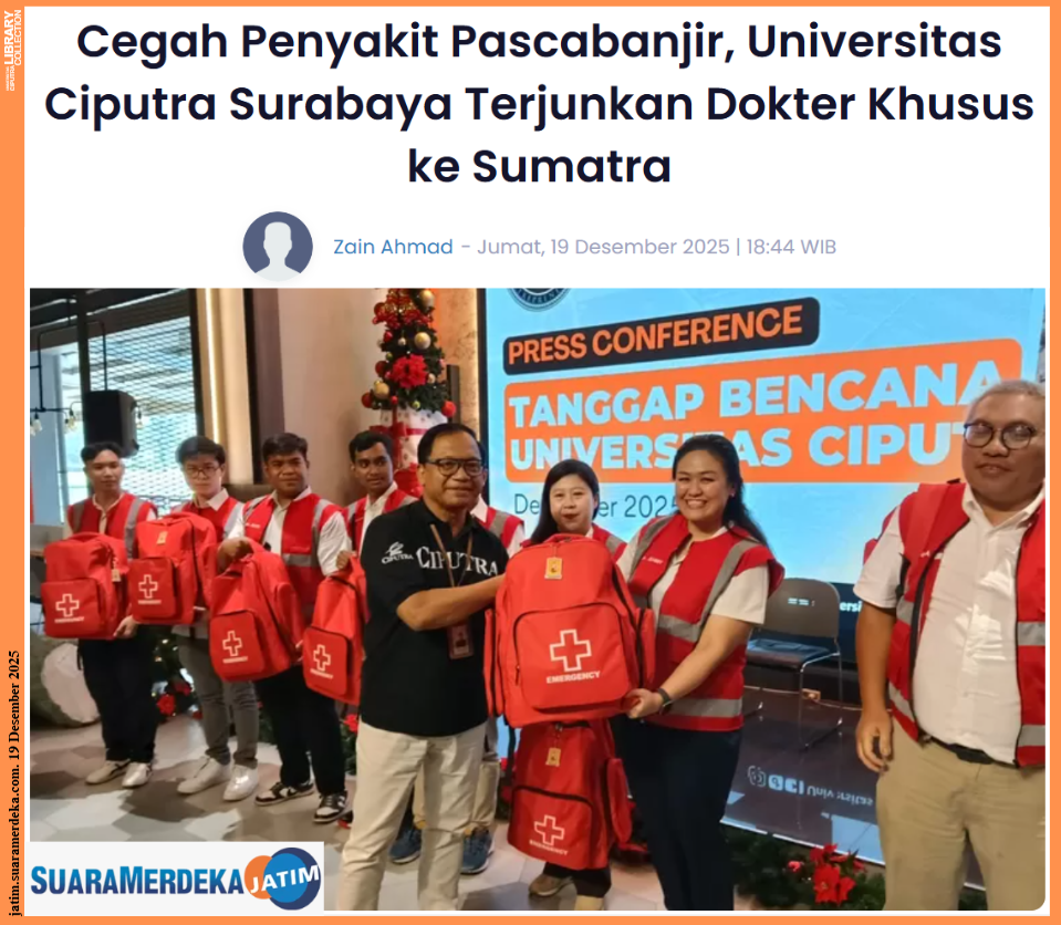JATIM.SUARAMERDEKA.COM – Fakultas Kedokteran (FK) Universitas Ciputra (UC) Surabaya memberangkatkan 10 dokter khusus ke wilayah terdampak banjir di Sumatra, Jumat (19/12/2025).